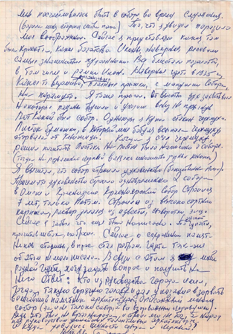 В статье К. Попов описал достоверно как в период сталинизма истреблялись невинные люди, имевшие свои суждения или люди с которыми хотели свести счеты сиксоты и др. В моей памяти сохранилось еще и другое. В это же время, по чией-то указке, взрывались и рушились шедевры архитектуры. (я имею в виду церкви, соборы, разницы между ними не знаю). В моей памяти Здание, в то время его называли новый Собор (он стоял на месте теперешнего дома Крайкома). По архитектуре собор был схож, с церквушкой, которая стоит на углу улиц им Сурикова и Мира. Но собор был громадной величины и изумительной красоты (см на обороте) Мне посчастливилось быть в соборе во время служения (водила меня старшая сестра папы) То, что я увидел поразило мое воображение. Сейчас я представляю какая там была красота, какое богатство. Иконы, наверно, рисовали самые знаменитые художники. Все блистало позолотой, в том числе и рамки икон. Наверное гдето в 1935 г, какое-то ведомство, организовало платные прыжки, с макушки Собора, на парашуте. Я тоже прыгал. От высоты дух захватывало. Некторые пацаны трусили и уходили вниз не прыгнув. Вот такой был собор. Однажды я купил стакан черемухи. Листок бумаги, в который мне бабуля всыпала черемуху, оторвала от книжицы. Когда я съел черемуху, решил почитать листок. На листке было написано о соборе. (тогда на развалинах церквей валялось множество разных книжек)