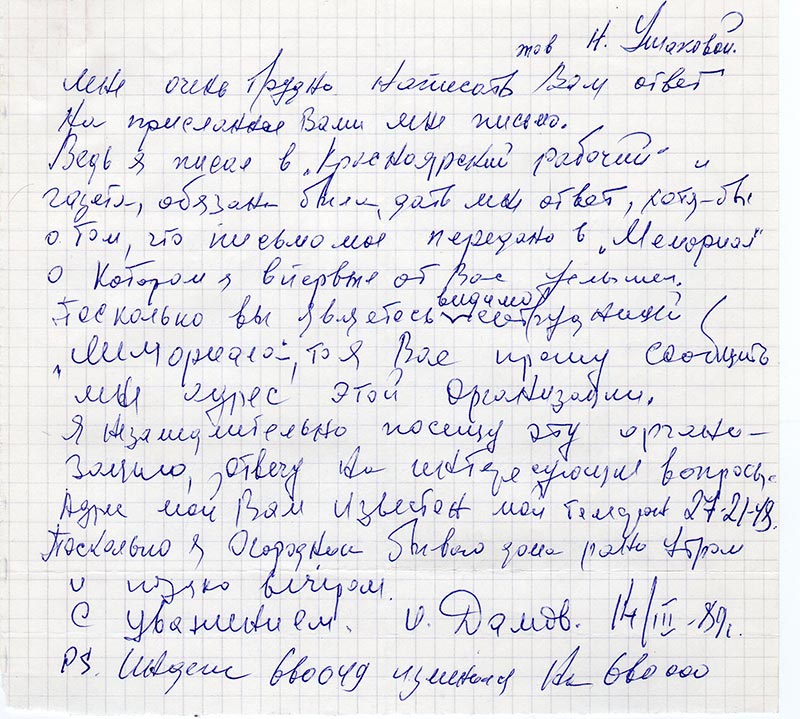 Ведь я писал в «Красноярский рабочий» и газета обязана была дать мне ответ, хотя бы о том, что письмо передано в «Мемориал» о котором я впервые от Вас услышал.