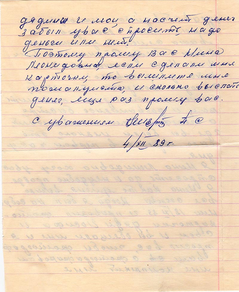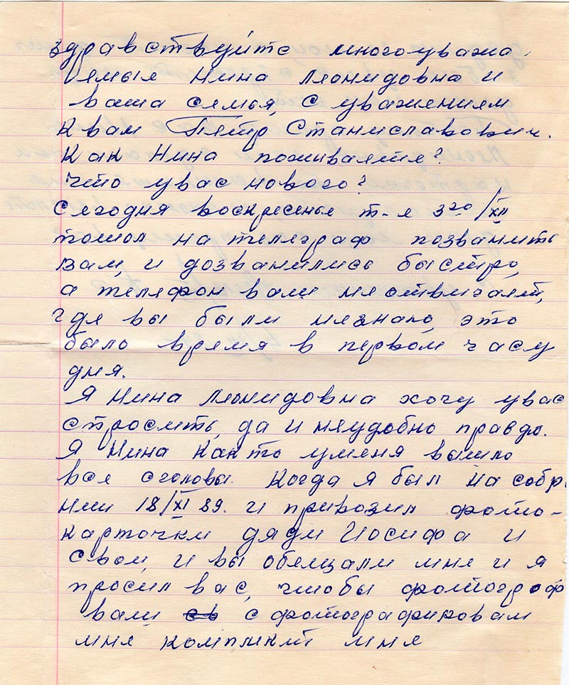Я Нина Леонидовна хочу в вас спросить, да и неудобно, правда. Я Нина как то у меня вышло все с головы. Когда я был на собрании 18/XI 89 г. и привозил фотокарточки дяди Иосифа и свои, и вы обещали мне и я просил вас, чтобы фотогрофировали с