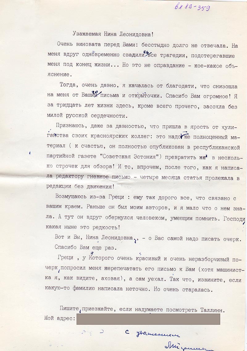 Вот и Вы, Нина Леонидовна, - о Вас самой надо писать очерк. Спасибо Вам еще раз. Греци, у Которого очень красивый и очень неразборчивый почерк, попросил меня перепечатать его письмо к Вам (хотя машинистка я, как видите, аховая), а сам уехал. Так что, извините, если какую-то фамилию написала не точно. Но очень старалась.