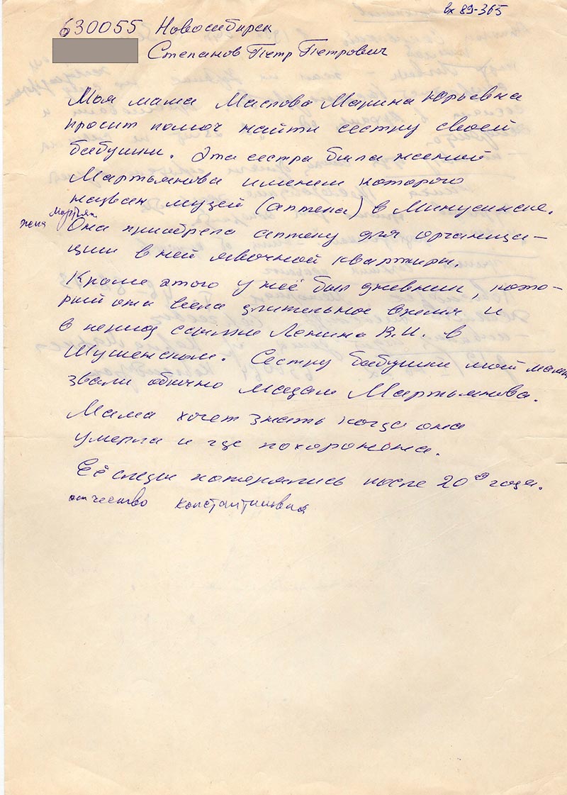Моя мама Маслова Марина Юрьевна просит помоч найти сестру своей бабушки. Эта сестра была женой Мартьянова именем которого назван музей (аптека) в Минусинске. Жена Мартьянова Она приобрела аптеку для организации в ней явочной квартиры.