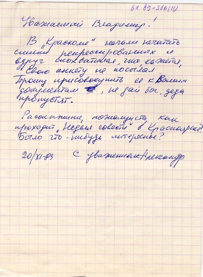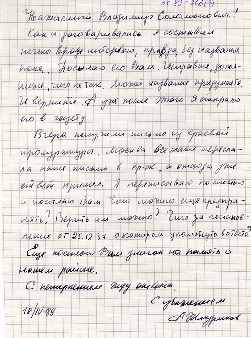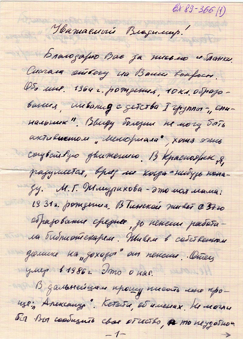Благодарю Вас за письмо и бланки. Сначала отвечу на Ваши вопросы. Обо мне. 1964 г. рождения, 10 кл. образования, инвалид с детства. Ввиду болезни не могу быть активистом «мемориала», хотя очень сочувствую движению. В Красноярск я, разумеется, вряд ли когда-нибудь попаду. М.Г. Жмурикова - это моя мама: 1931 г. рождения. В Тинской живет с 37-го образование среднее, до пенсии работала библиотекарем. Живем в собственном домике на «доходы» от пенсии. Отец умер в 1986 г. Это о нас.