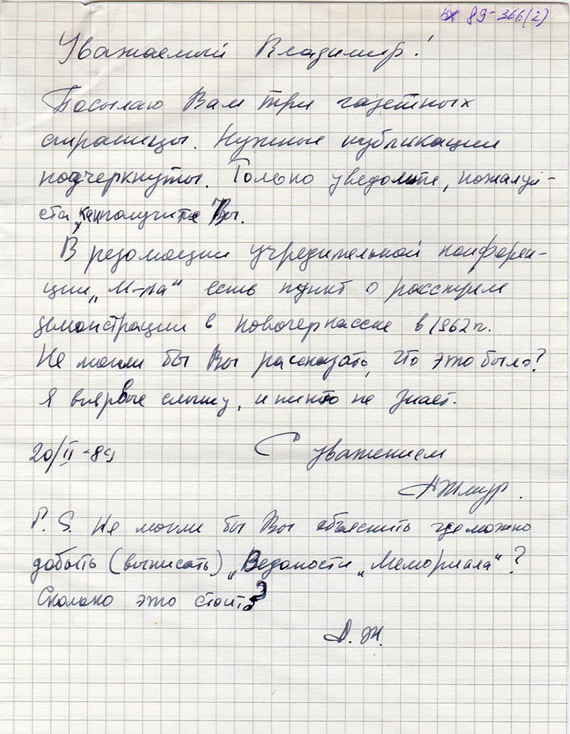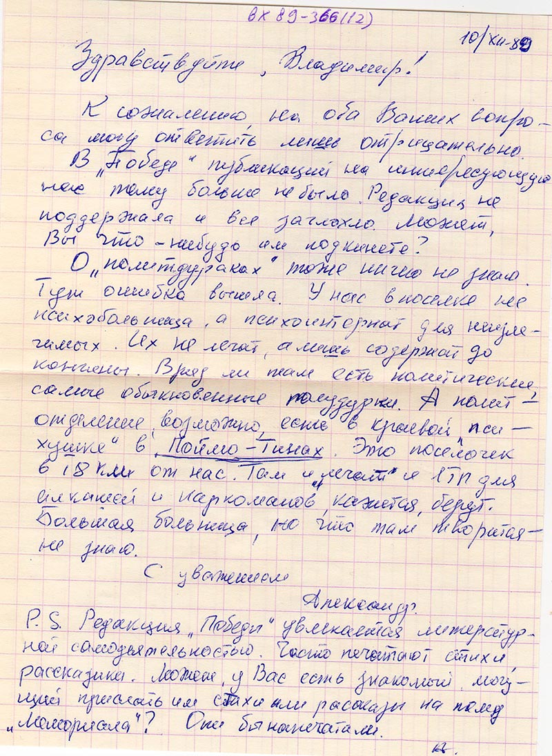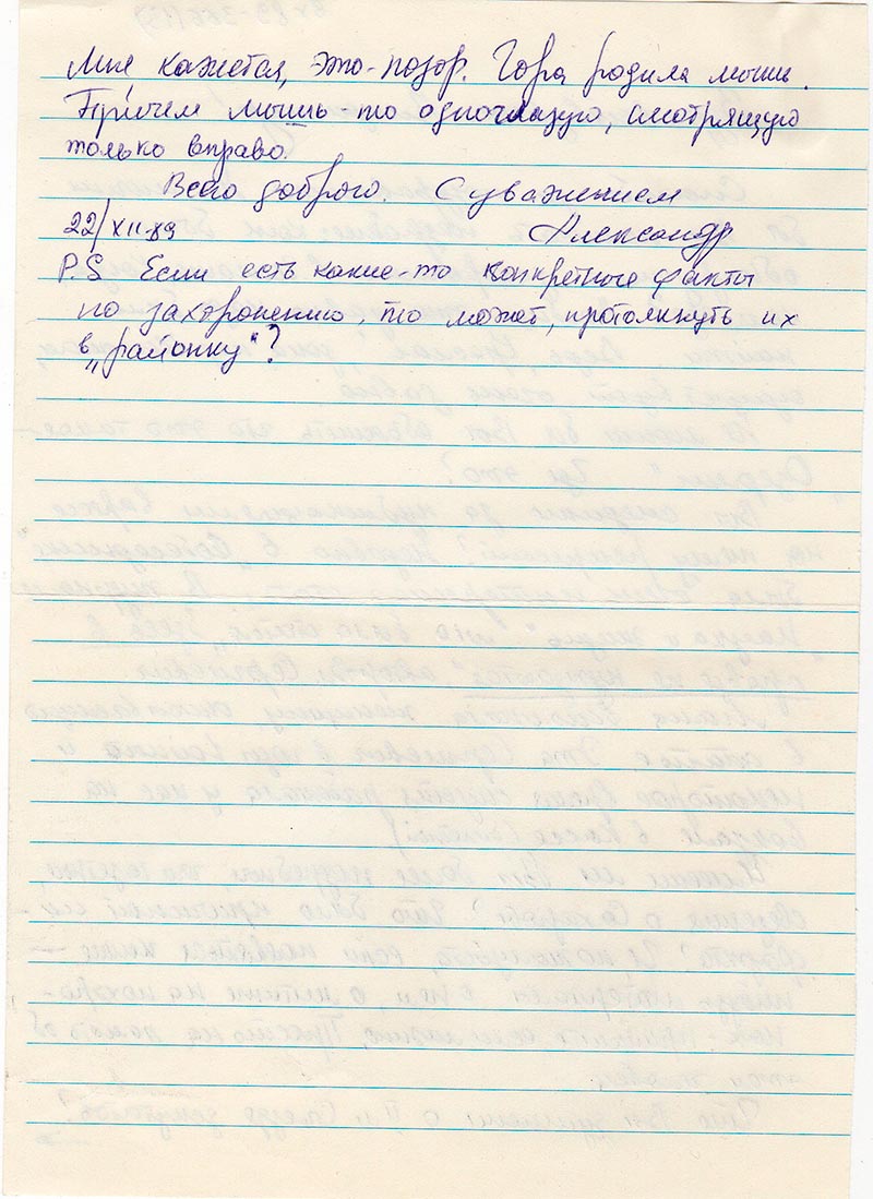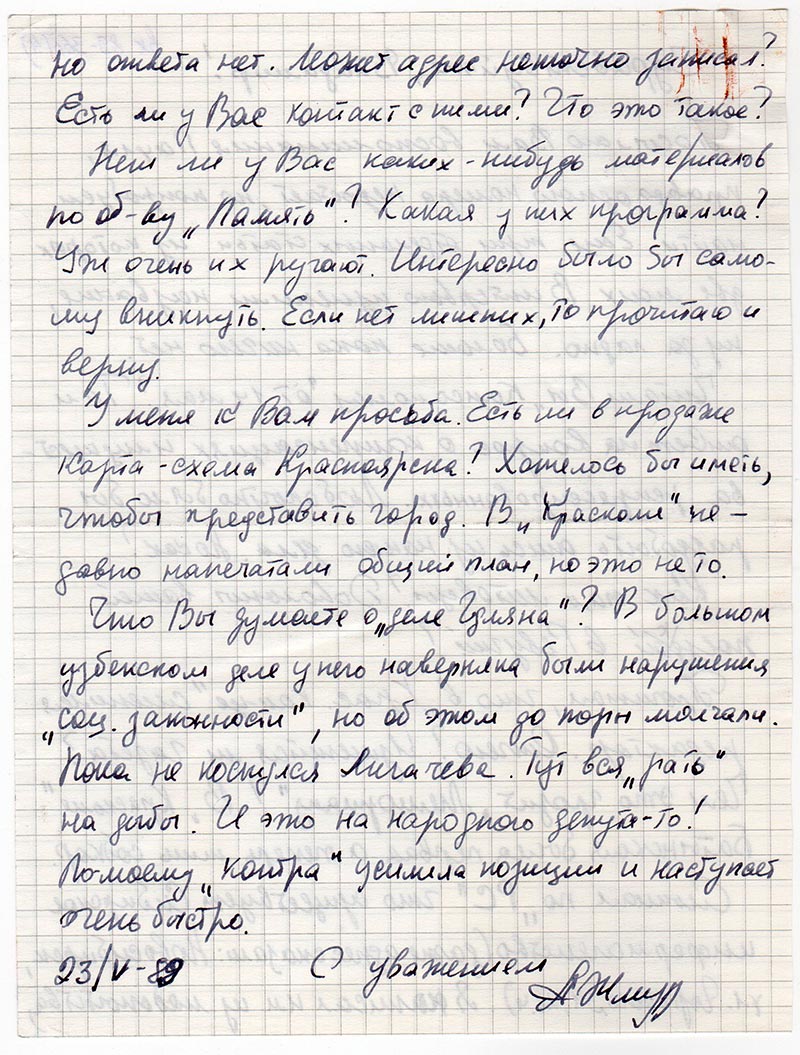 P.S. Редакция «Победы» увлекается литературной самодеятельностью. Часто печатают стихи, рассказики. Может, у Вас есть знакомый могущий прислать им стихи или рассказы на тему «Мемориала»? Они бы напечатали.