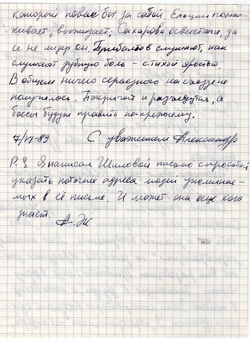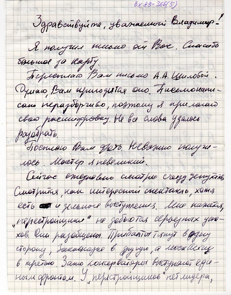 Пересылаю Вам письмо А.А. Шиловой. Думаю, Вам пригодиться оно. Письмо написано не разборчиво, поэтому я прилагаю свою расшифровку. Не все слова удалось разобрать.