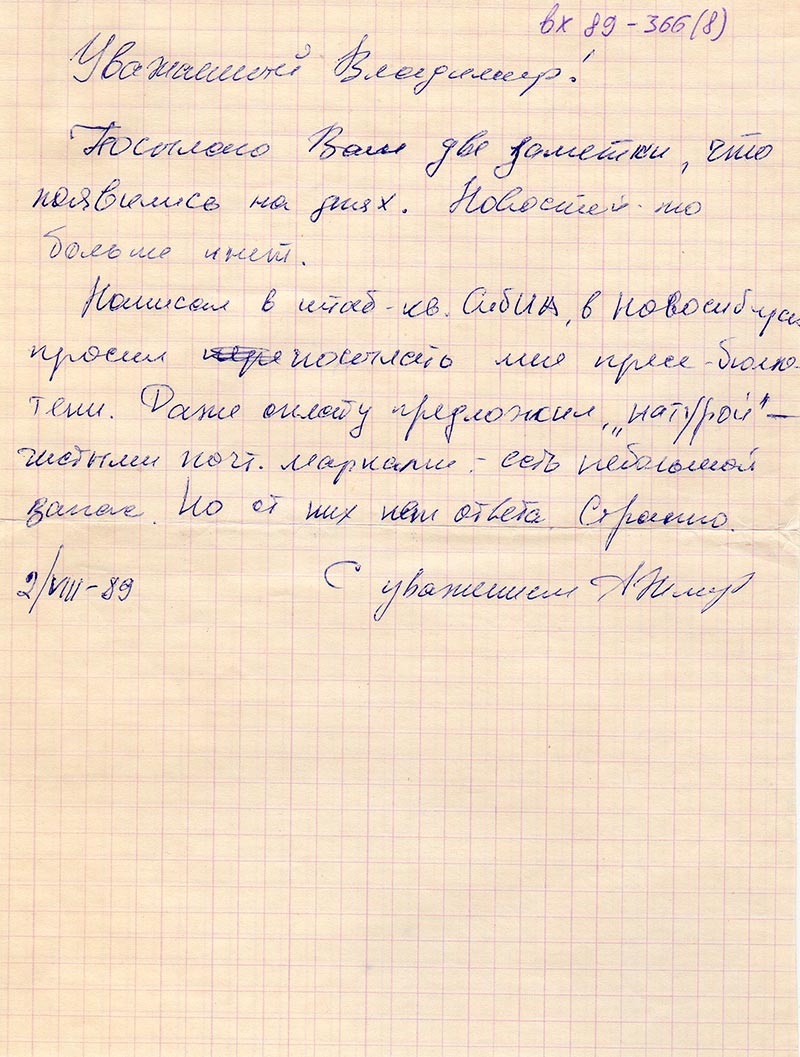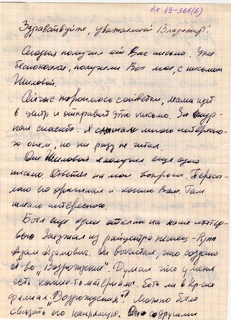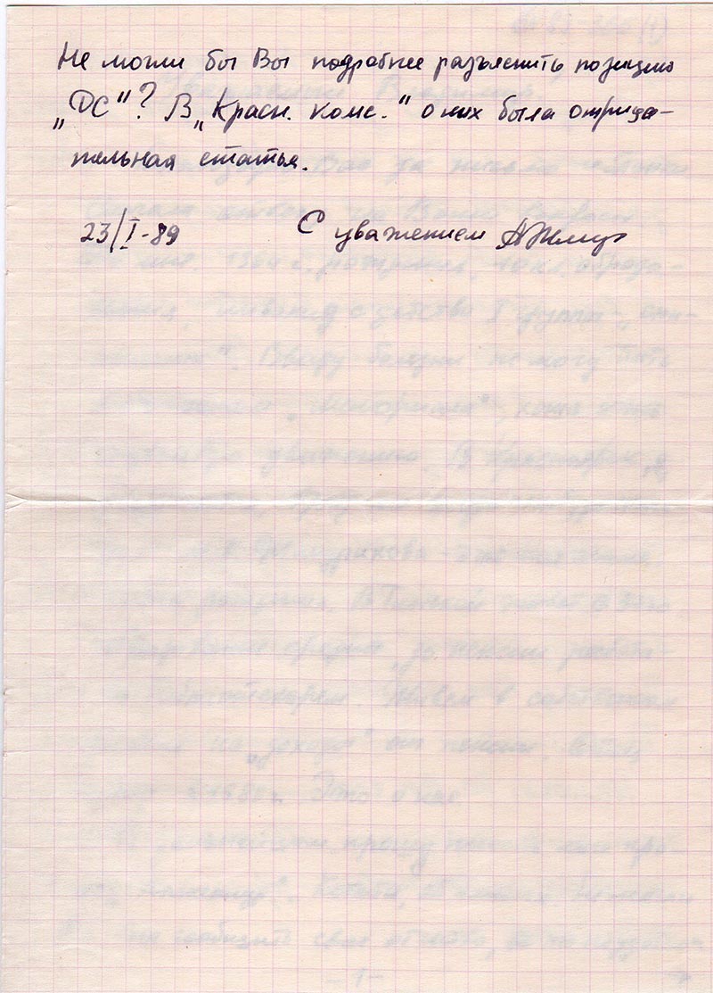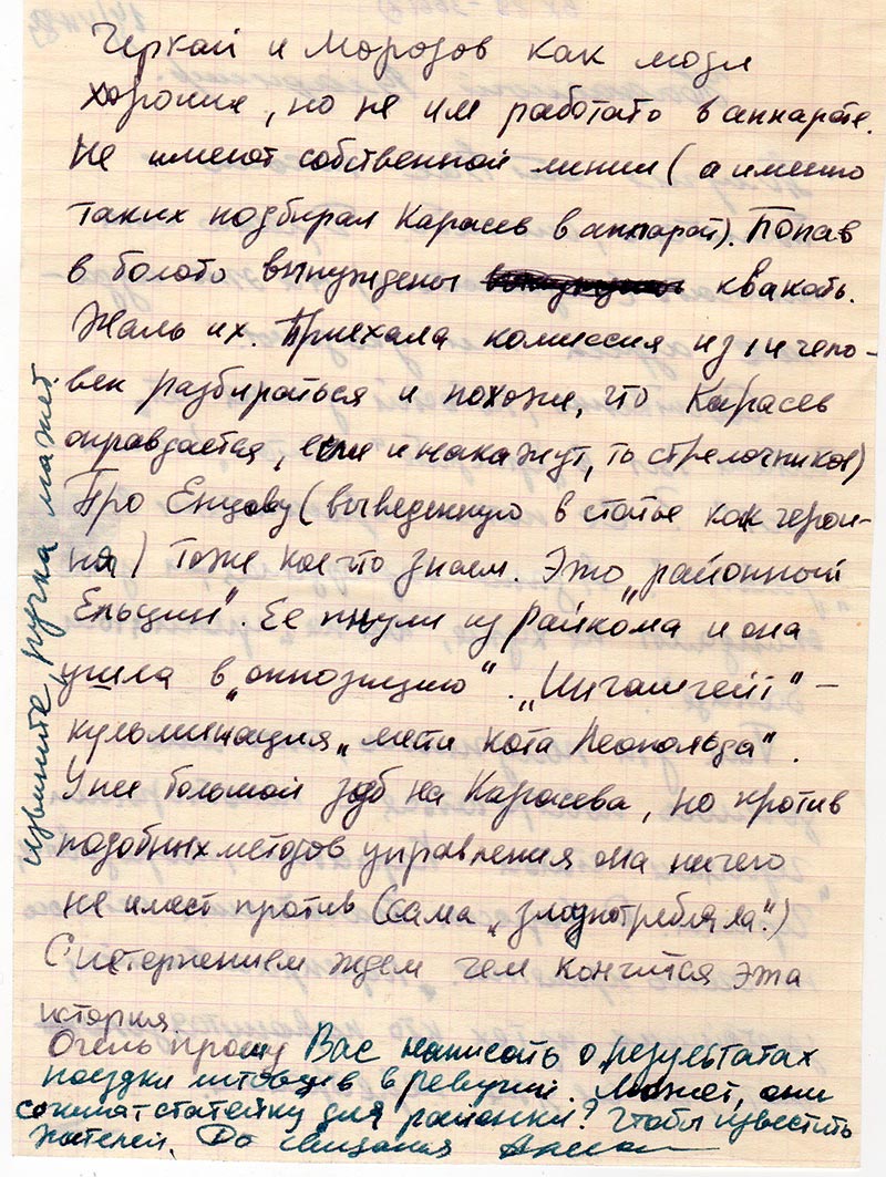 Очень прошу Вас написать о результатах поездки литовцев в ревучий. Может они сочинят статейку для районки? Чтобы известить жителей. До свиданья (подпись)