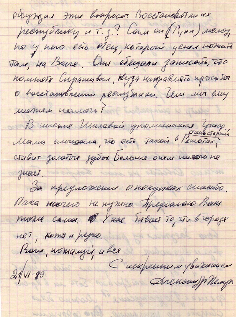 Был еще один отклик на наше интервью. Заезжал из райцентра немец – Рупп Адам Адамович. Он вычитал, что создано об-во «Возрождения». Можно было связать его напрямую. Он с другими обсуждал эти вопросы. Восстановят ли их республику и т.д.? Сам он (Рупп) молод, но у него есть отец, который успел пожить там, на Волге. Они обещали записать, что помнят. Спрашивал, куда направлять просьбы о восстановлении республики. Чем мы ему можем помочь?