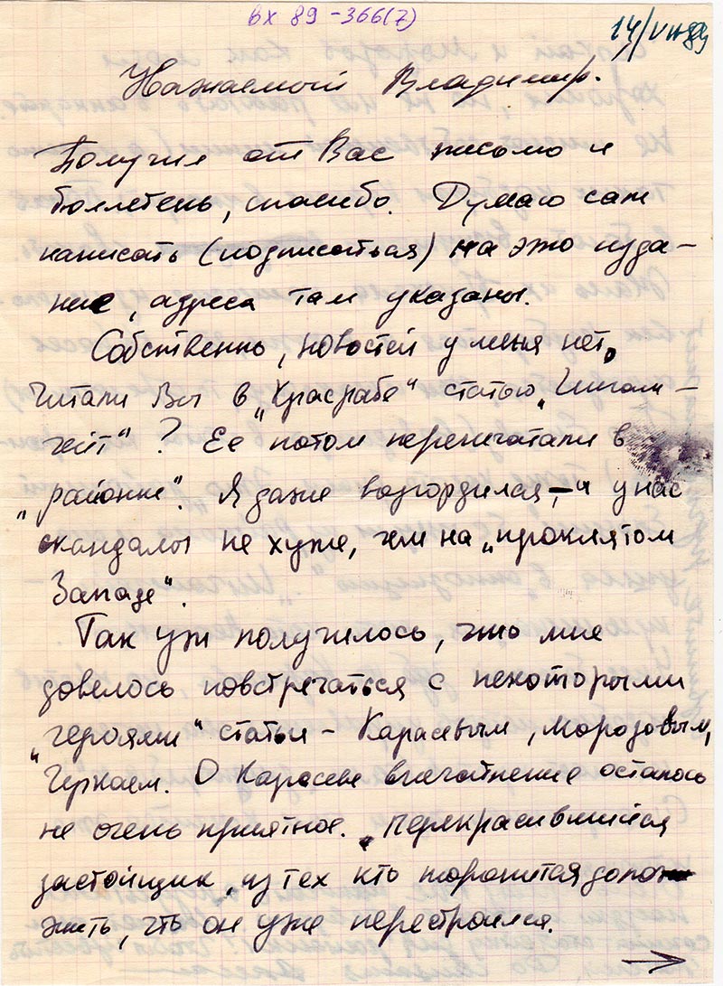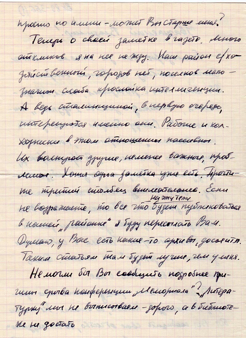 Теперь о своей заметке в газете. Много откликов на нее я не жду. Наш район с/хозяйственный, городов нет, поселков мало- значит слаба прослойка интеллигенции. А ведь сталинщиной, в первую очередь, интересуются именно они. Рабочие и колхозники в этом отношении пассивны. Их волнуют другие, неменее важные, проблемы. Хотя одна заметка уже есть. Прочтите третий столбец внимательнее. Если не возражаете, то все что на эту тему будет публиковаться в нашей «районке» я буду пересылать Вам. Думаю, у Вас есть какие-то архивы, досье и т.п. Таким статьям там будет лучше, чем у меня.