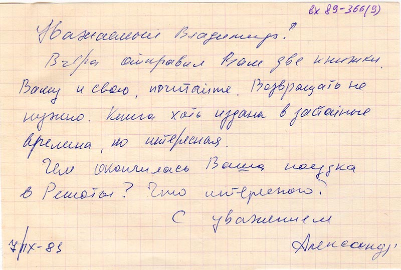 Вчера отправил Вам две книжки. Вашу и свою, почитайте. Возвращать не нужно. Книга хоть издана в застойные времена, но интересная.
