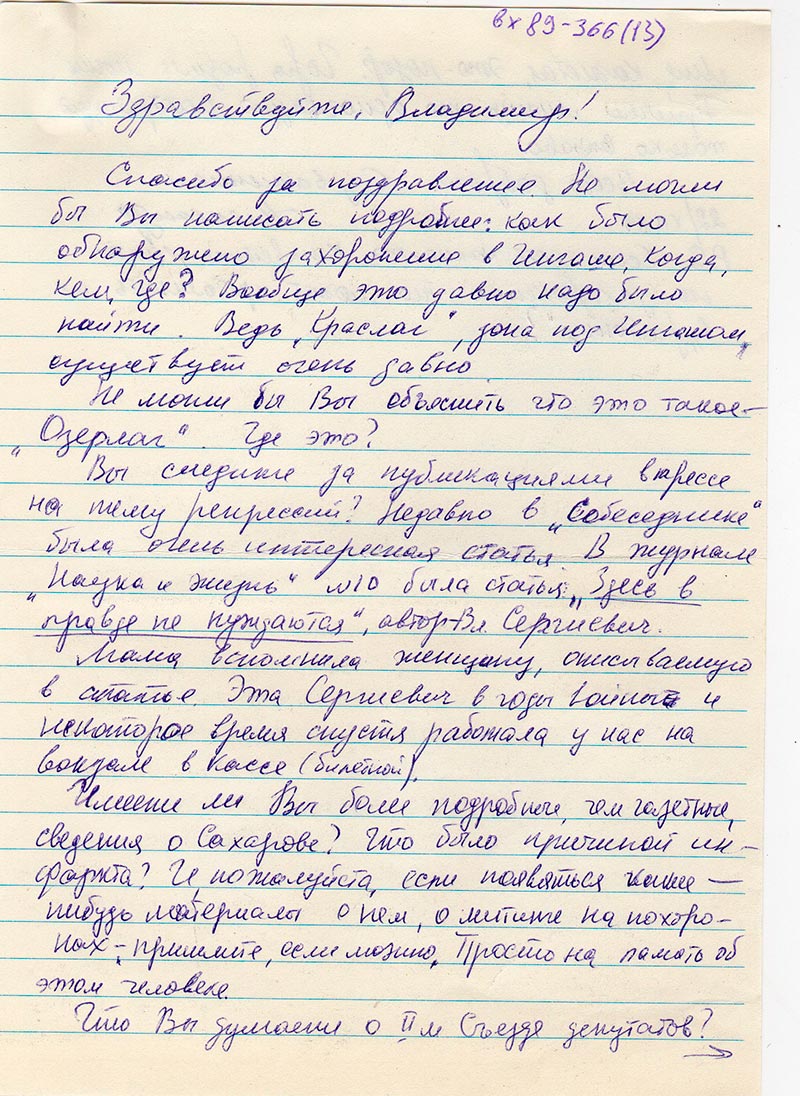 Имеете ли Вы более подробные, чем газетные, сведения о Сахарове? Что было причиной инфаркта? И пожалуйста, если появяться какие-нибудь материалы о нем, о митинге на похоронах, - пришлите, если можно. Просто на память об этом человеке.