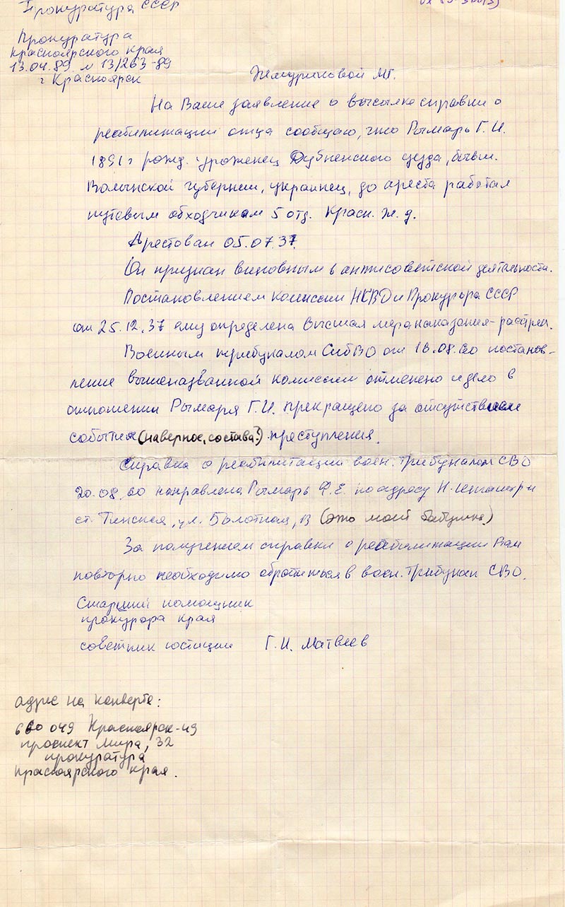 На Ваше заявление о высылке справки о реабилитации отца сообщаю, что Рымарь Г.И. 1891 г. рожд. уроженец Дубненского уезда, бывш. Волынской гебернии, украинец, до ареста работал путевым обходчиком 5 отд. Красн. ж.д.