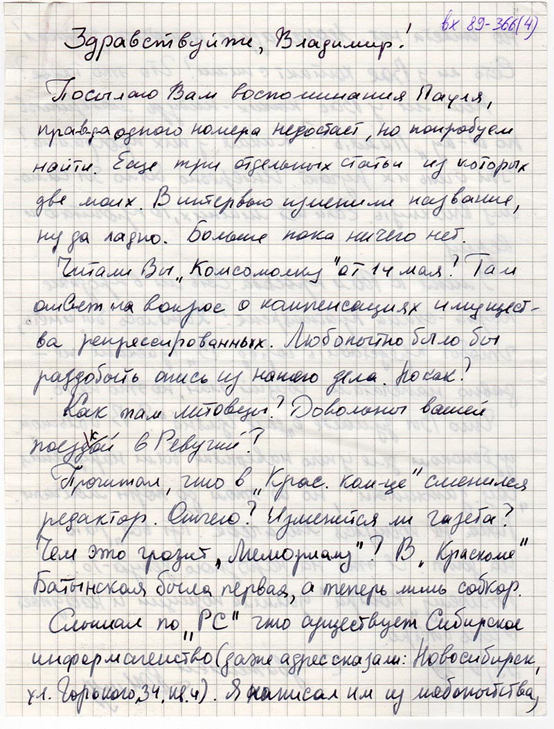 Вы, наверное, получили письмо из Тасеево от некоей Бесовой. Это я ей дал Ваш адрес. Попробуйте привлечь ее к работе в «мемориале». Ее положение такое же как и у меня.