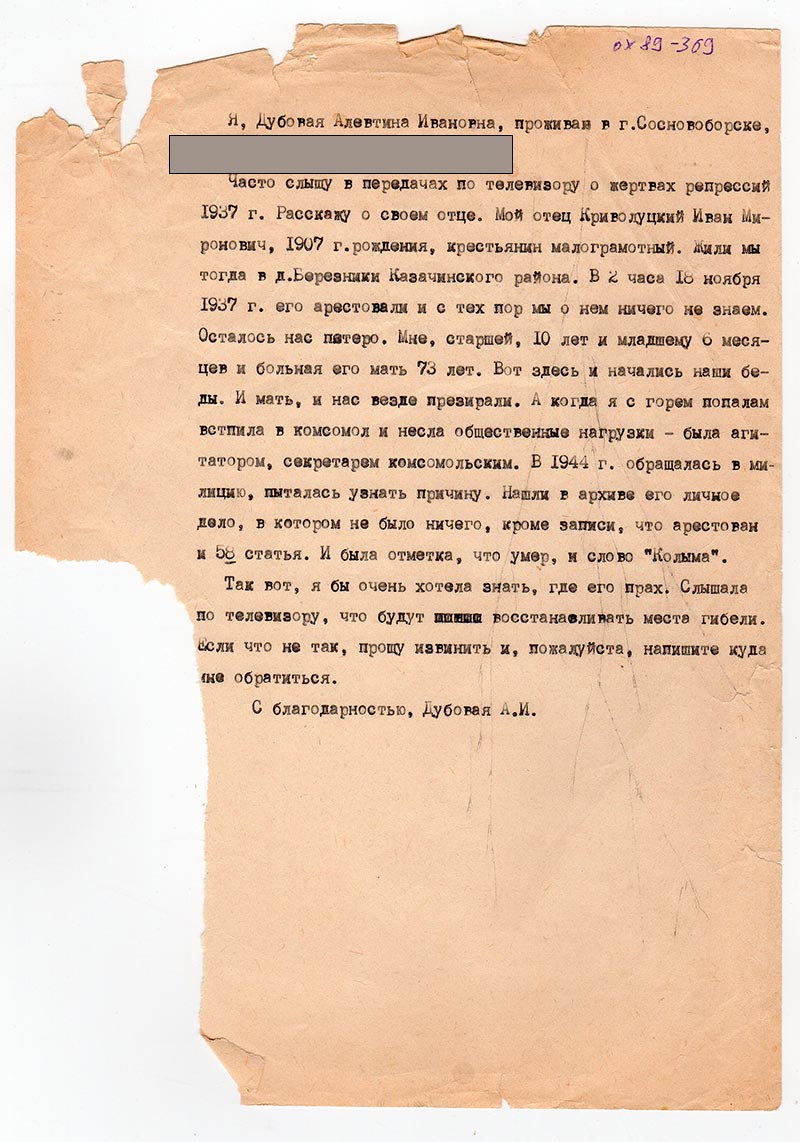 Часто слышу в передачах по телевизору о жертвах репрессий 1937 г. Расскажу о своем отце. Мой отец Криволуцкий Иван Миронович, 1907 г. рождения, крестьянин малограмотный. Жили мы тогда в д. Березники Казачинского района. В 2 часа 18 ноября 1937 г. его арестовали и с тех пор мы о нем ничего не знаем.