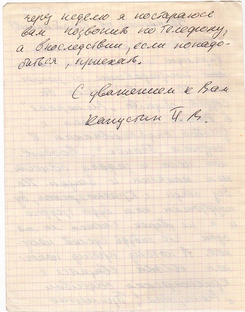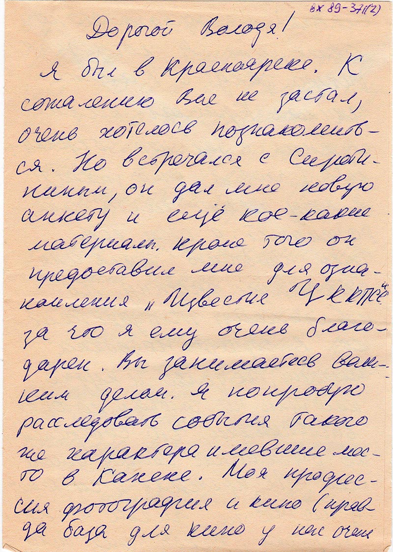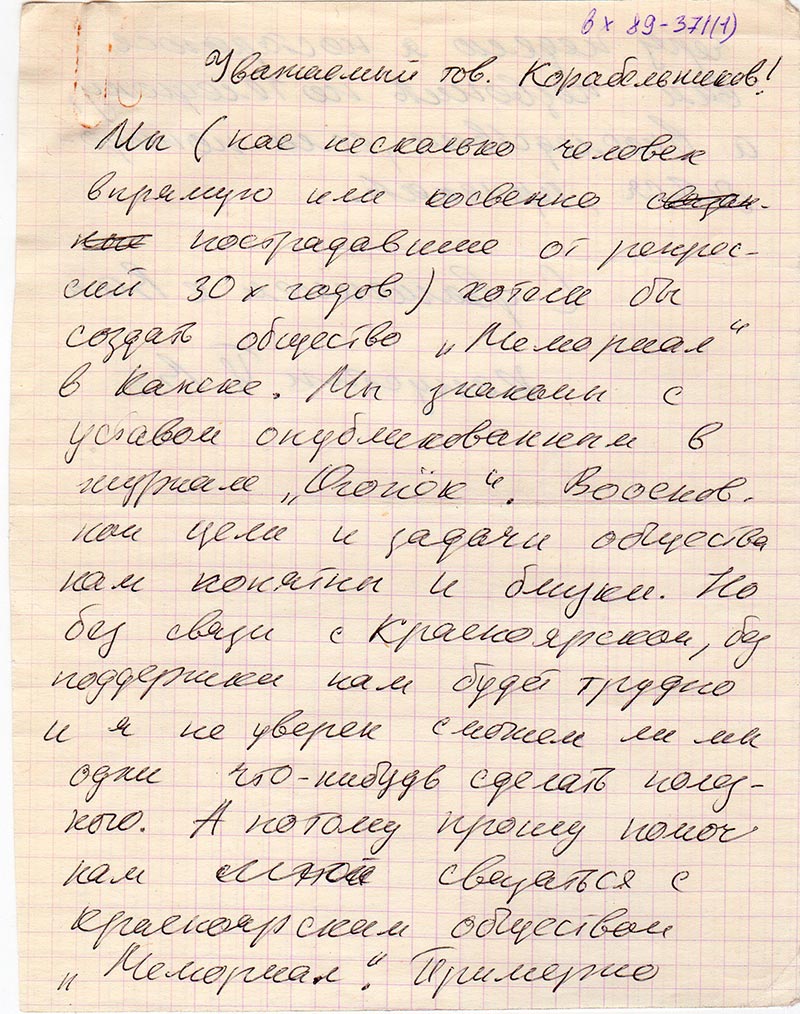 Мы (нас несколько человек впрямую или косвенно пострадавшие от репрессий 30-х годов) хотели бы создать общество «Мемориал» в Канске. Мы знакомы с уставом опубликованным в журнале «Огонёк». В основном цели и задачи нам понятны и близки. Но без связи с Красноярском, без поддержки нам будет трудно и я не уверен сможем ли мы одни что-нибудь сделать полезного. А потому прошу помочь нам и связаться с Красноярским обществом «Мемориал». Примерно через неделю я постараюсь вам позвонить по телефону, а в последствии, если понадобиться, приехать.
