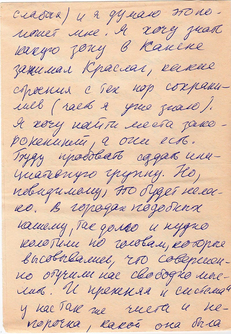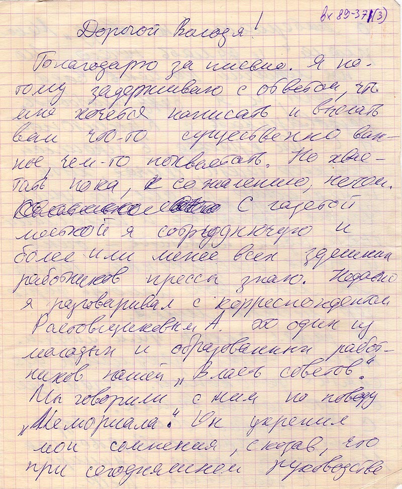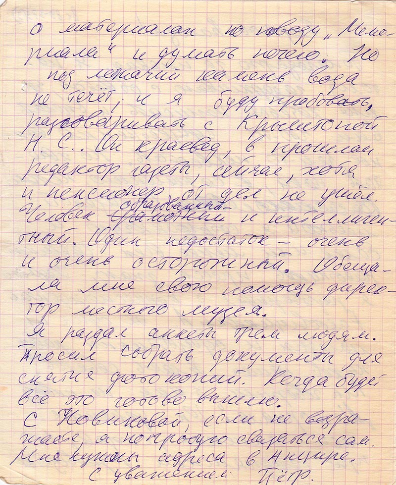 Благодарю за письмо. Я потому задерживаю с ответом, что мне хочется написать и выслать вам что-то существенно важное, чем-то похвастать. Но хвастать пока, к сожалению, нечем. С газетой местной я сотрудничаю и более или менее всех здешних работников прессы знаю. Недавно я разговаривал с корреспондентом Растовщиковым А. Это один из молодых и образованных работников нашей «Власть советов». Мы говорили с ним по поводу «Мемориала». Он укрепил мои сомнения, сказав, что при сегодняшнем руководстве о материалах по поводу «Мемориала» и думать нечего. Но под лежачий камень вода не течёт, и я буду пробовать, разговаривать с Крыштопой Н.С. Он краевед, в прошлом редактор газеты, сейчас, хотя и пенсионер, от дел не ушёл. Человек образованный и интеллигентный. Один недостаток – очень и очень осторожный. Обещала мне свою помощь директор местного музея.