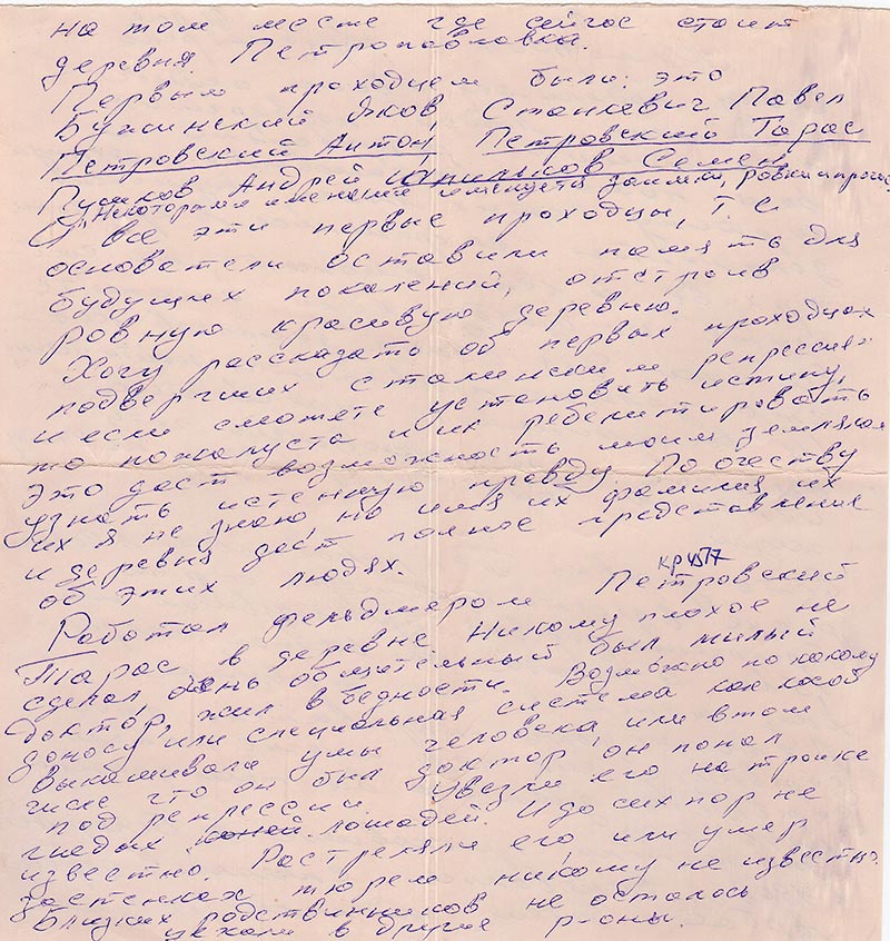 Работал фельдшером Петровский Тарас в деревне. Никому плохое не сделал, очень общительный был милый доктор, жил в бедности. Возможно по какому доносу или специальная система как косой выкашивала умы человека, или втом числе что он был доктор он попал под репрессии. Увезли его на тройке гнедых коней лошадей. И до сих пор не известно. Растреляли его, или умер застенках тюрем никому не известно. Близких родственников не осталось уехали в другие р-ны.