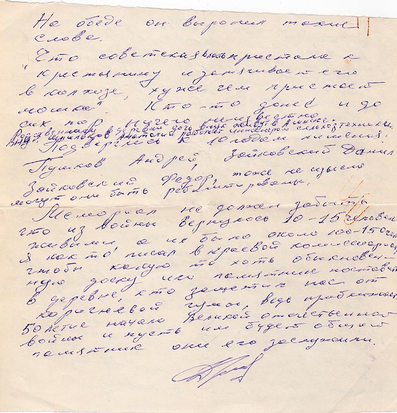 Мемориал не должен забыть что из войны вернулось 10-15 человек живыми, а их было около 100-150 чел. Я как то писал в краевой комиссариат, чтобы какую то хоть обыкновенную доску или памятник поставить в деревне, кто защитил нас от коричневой чумы, ведь приближается 50-летие начало Великой Отечественной войны и пусть им будет общий памятник они его заслужили.
