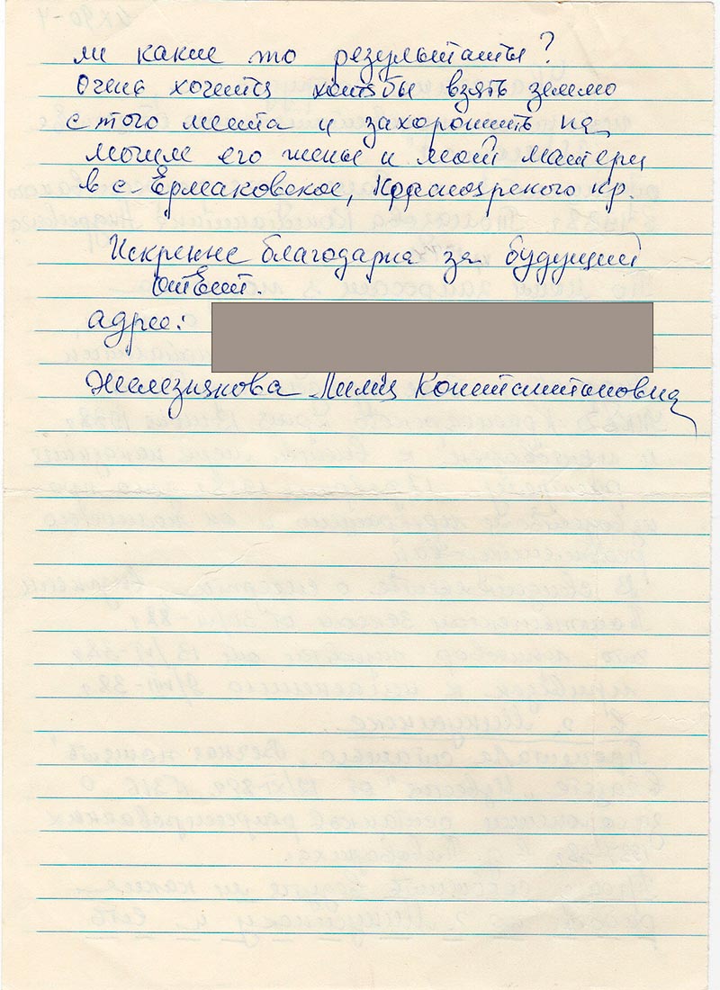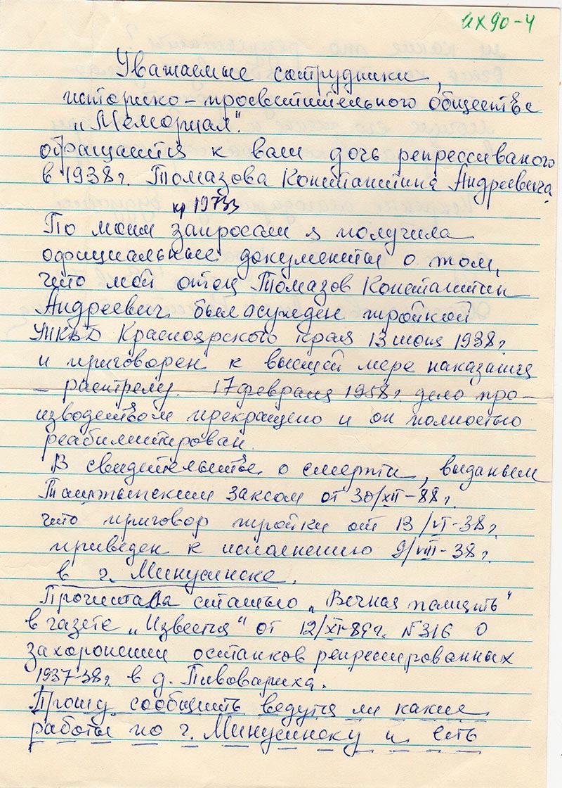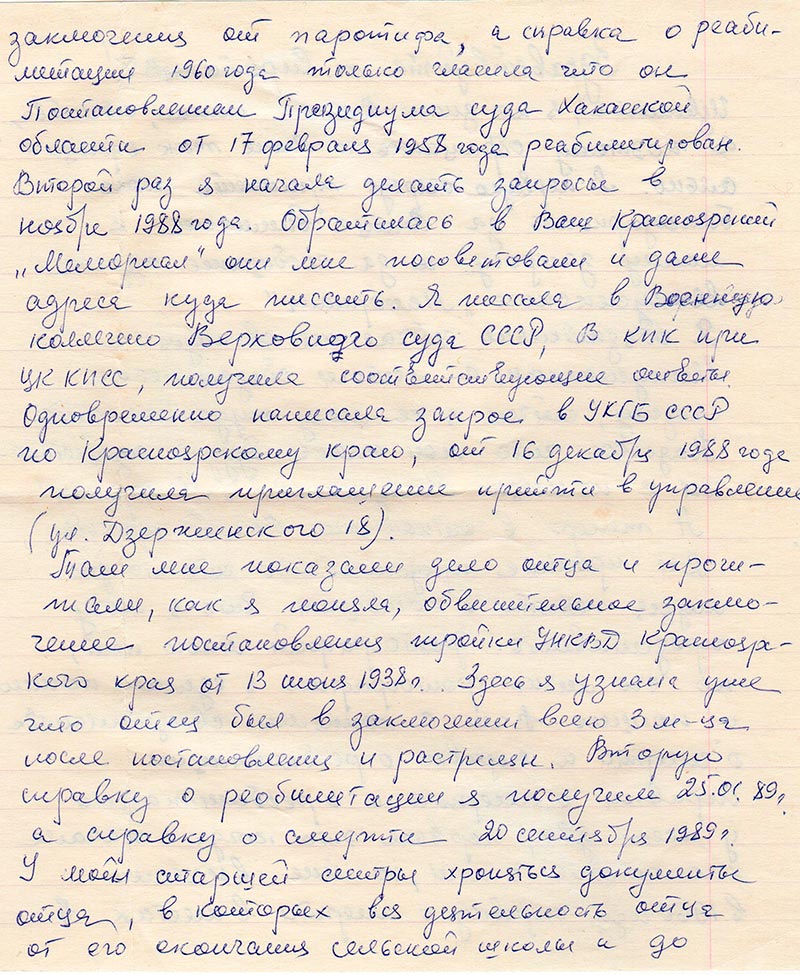 Второй раз я начала делать запросы в ноябре 1988 года. Обратилась в Ваш Красноярский «Мемориал» они мне посоветовали и дали адреса куда писать. Я писала в Военную коллегию Верховного суда СССР, В КИК при ЦК КПСС, получила соответствующие ответы. Одновременно написала запрос в УКГБ СССР по Красноярскому краю, от 16 декабря 1988 года получила приглашение прийти в управление (ул. Дзержинского 18).