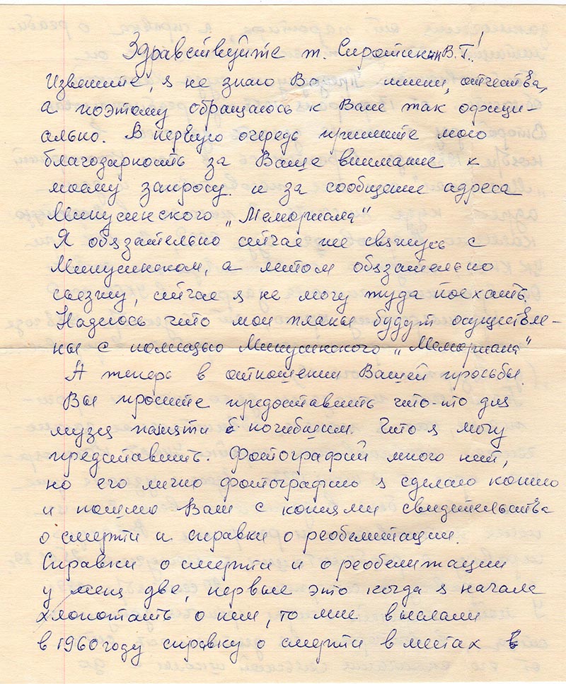 Я обязательно сейчас же свяжусь с Минусинском, а потом обязательно съезжу, сейчас я не могу туда поехать. Надеюсь что мои планы будут осуществлены с помщью Минусинского «Мемориала». А теперь в отношении Вашей просьбы. Вы просите предоставить что-то для музея памяти б погибшим. Что я могу представить. Фотографий много нет, но его лично фотографию я сделаю копию и пошлю Вам с копиями свидетельства о смерти и справки о реобелитации. Справки о смерти и о реобелитации у меня две, первые это когла я вначале хлопотать о нем, то мне выслали в 1960 году справку о смерти в местах в заключения от паротифа, а справка о реабилитации 1960 года гласила что он Постановлением Президиума суда Хакасской области от 17 февраля 1958 года реабилитирован.