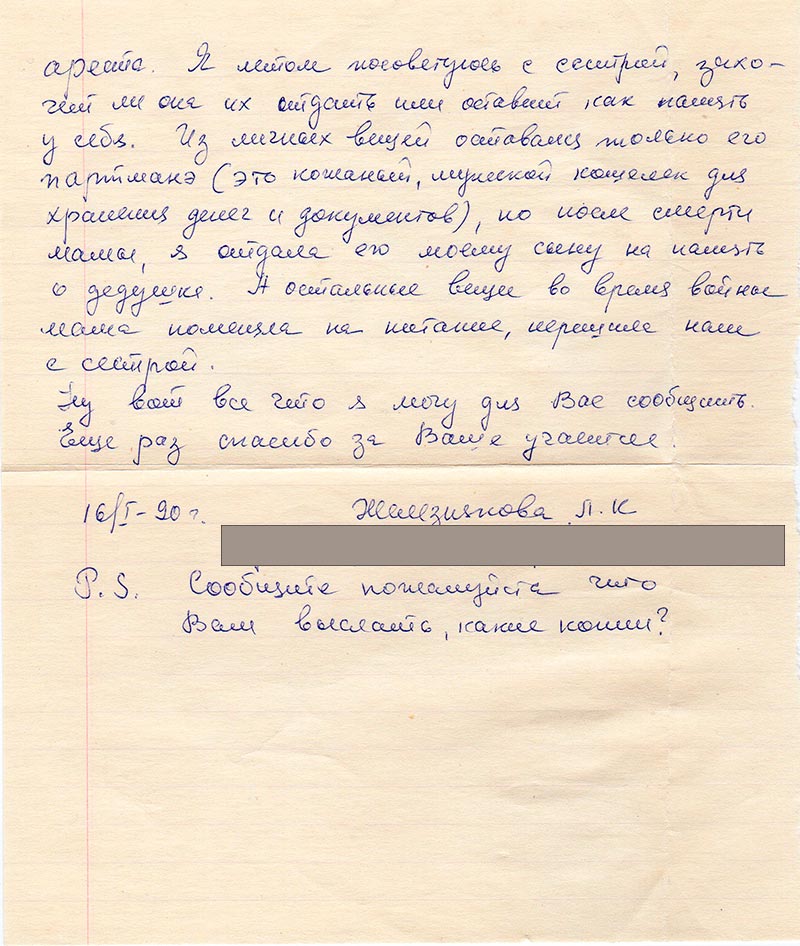 от его окончания сельской школы и до ареста. Я летом посоветуюсь с сестрий, захочет ли она их отдать или оставит как как память у себя. Из личных вещей оставался только его партманэ (это кожаный, мужской кошелек для хранения денег и документов), но после смерти мамы, я отдала его моему сыну на память о дедушке. А остальные вещи во время войны мама поменяла на питание, перешила нам с сестрой.