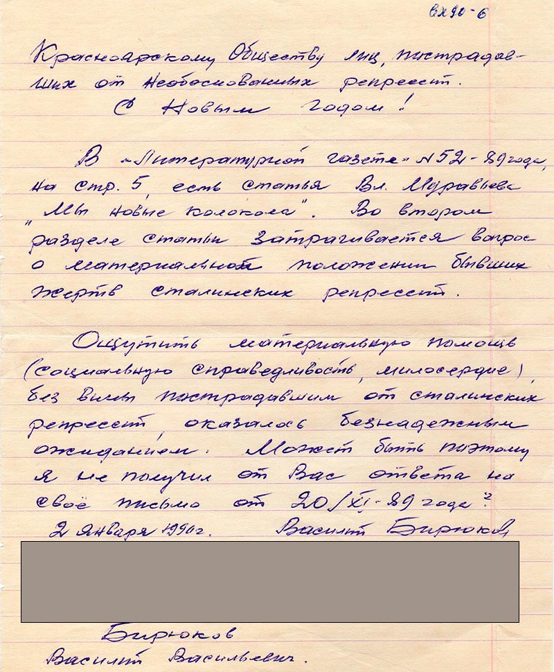 В «Литературной газете» № 52 – 89 года, на стр. 5, есть статья Вл. Муравьева «Мы новые колокола». Во втором разделе статьи затрагивается вопрос о материальном положении бывших жертв сталинских репрессий. Ощутить материальную помощь (социальную справедливость, милосердие), без вины пострадавшим от сталинских репрессий, оказалось безнадежным ожиданием. Может быть паэтому я не получил от Вас ответа на своё письмо от 20/XI – 89 года?