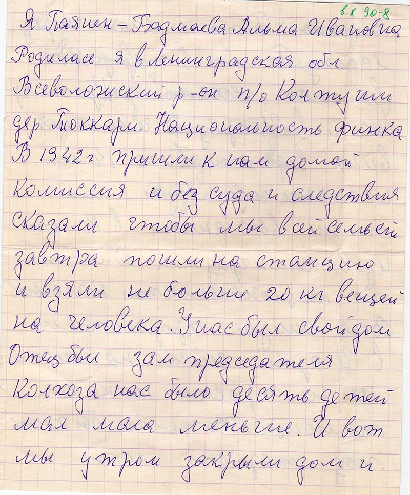 Я Паянен-Бадмаева Альма Ивановна Родилась я в Ленинградская обл. Всеволожский р-он п/о Колтуши дер. Токкари. Национальность финка. В 1942 г. пришли к нам домой комиссия и без суда и следствия сказали чтобы мы всей семьей завтра пошли на станцию и взяли не больше 20 кг. вещей на человека. У нас был свой дом Отец был зам председателя колхоза Нас было десять детей мал мала меньше. И вот мы утром закрыли дом и пошли. Потом ехали через Ладогу. Потом в товарных вагонах ехали до Красноярска, и в Игарку. В чем моя вина ведь мне всего 14 лет исполнилось. Муж мой тоже высланный в 14 лет из Сталинградской области по национальности калмык