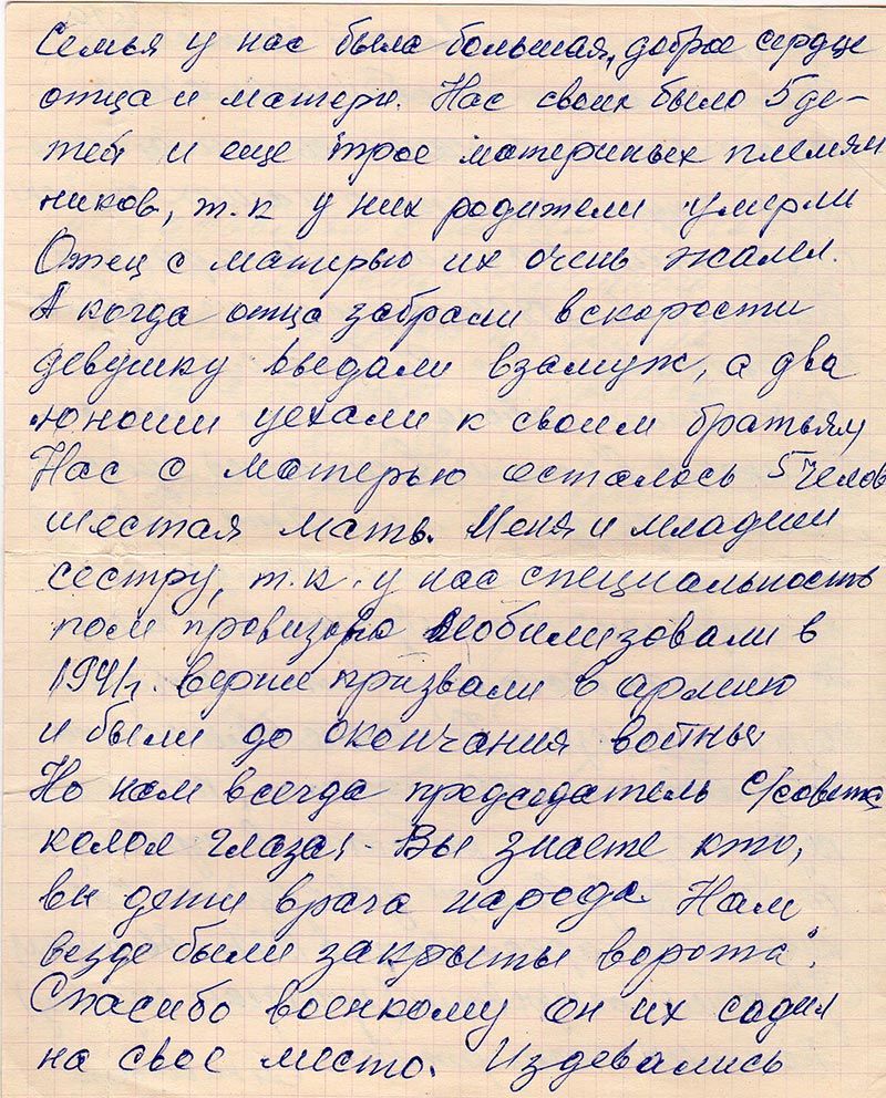 Семья у нас была большая, доброе сердце отца и матери. Нас своих было 5 детей и еще трое материных племянников, т. к у них родители умерли Отец с матерью их очень жалел. А когда отца забрали вскорости девушку выдали взамуж, а два юноши уехали к своим братьям Нас с матерью осталось 5 челове шестая мать. Меня и младши сестру, т. к. У нас специальность пом провизора мобилизовали в 1941г. вернее призвали в армию и были до окончания войны Но нам всегда председатель с/совета колол глаза: