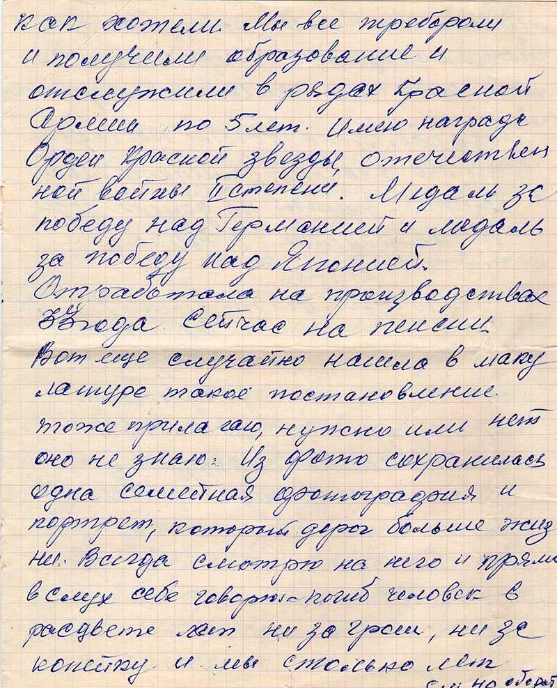 - Вы знаете кто, вы дети врага народа. Нам везде были закрыты ворота. Спасибо военкому он их садил на свое место. Издевались как хотели. Мы все перебороли и получили образование и отслужили в рядах Красной Армии по 5 лет. Имею награды Орден Красной звезды, Отечественной войны II степени. Медаль за победу над Германией и медаль за победу над Японией.