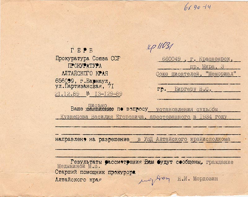 Ваше письмо по вопросу установления судьбы Кузнецова Василия Егоровича, арестованного в 1934 году направлено на разрешение в УВД Алтайского крайисполкома