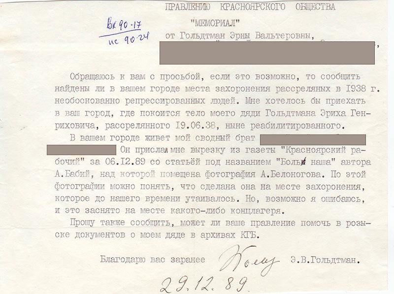Обращаюсь к вам с просьбой, если это возможно, то сообщить найдены ли в вашем городе места захоронения расстрелянных в 1938 г. необоснованно репрессированных людей. Мне хотелось бы приехать в ваш город, где покоится тело моего дяди Гольдтмана Эриха Генриховича, расстрелянного 19.06.38, ныне реабилитированного.