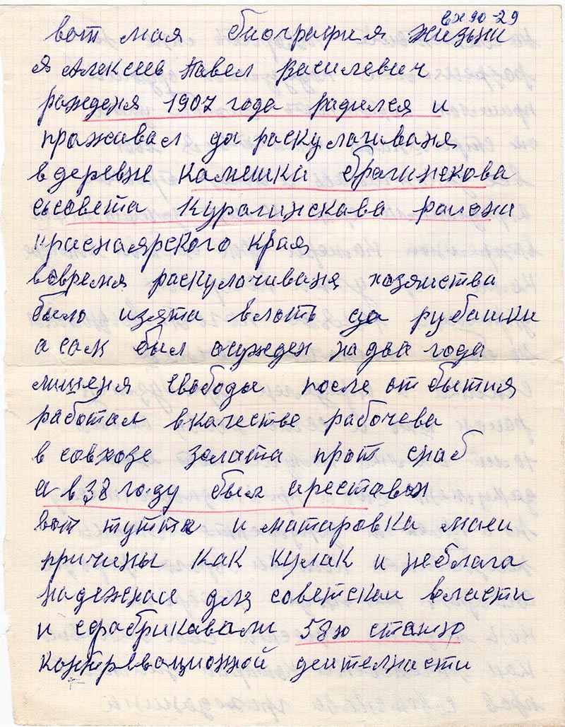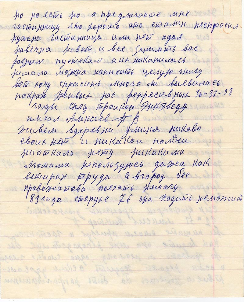 Но приехать я несмогу одно слабые глаза и асма недает ходить а ским удовольтвием хотелась ба быть на приглашение но но есть но а предлагаите мне гастинницу ето хорошо ато сталин неспросил нужна гастинница или нет адал навечна новот и все занимть вас разным пустекам а их накапилась немала можна написать целую гнигу вот хочу спрасить много ли выявилась покраю живых нас репресивных 36-37-38 годы спец троикои ЭНКЭВЕДЭ писал Алексеев П В