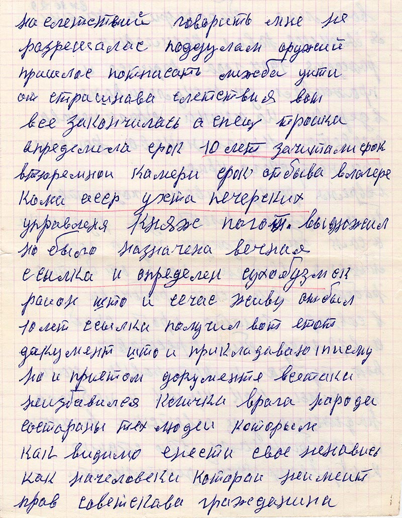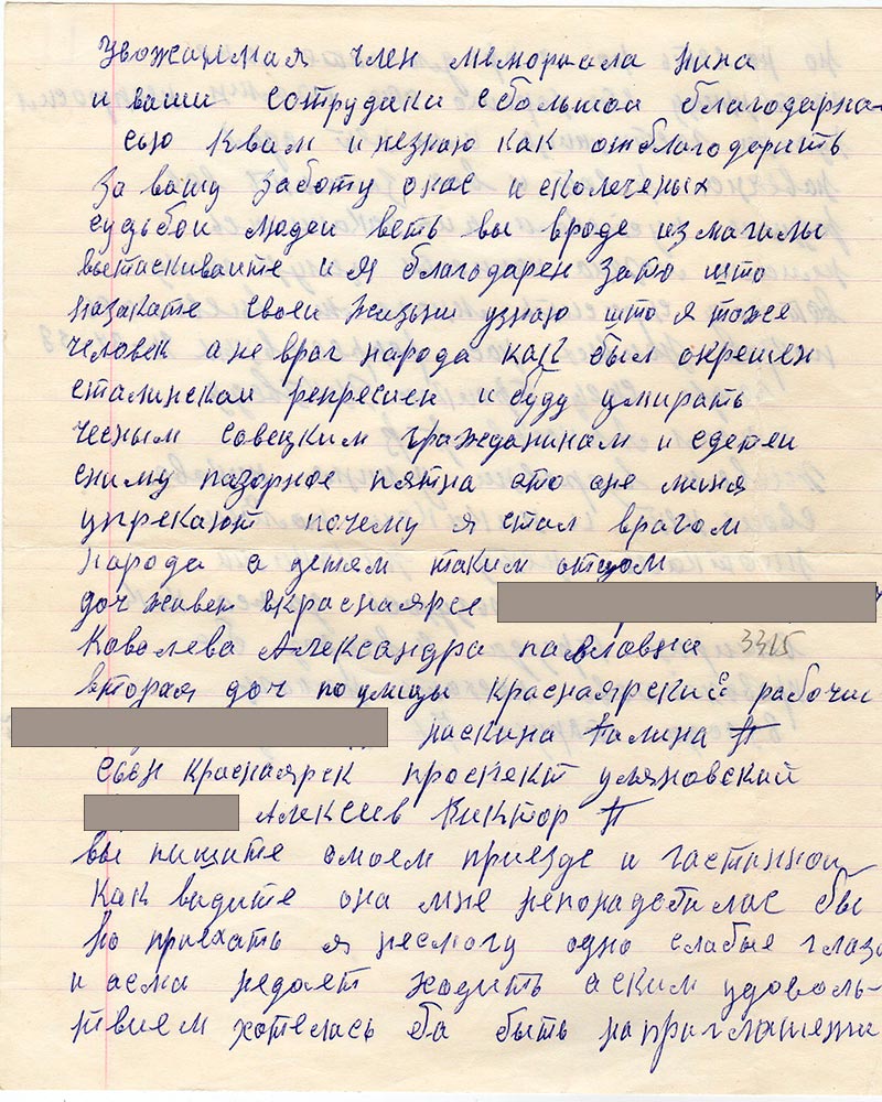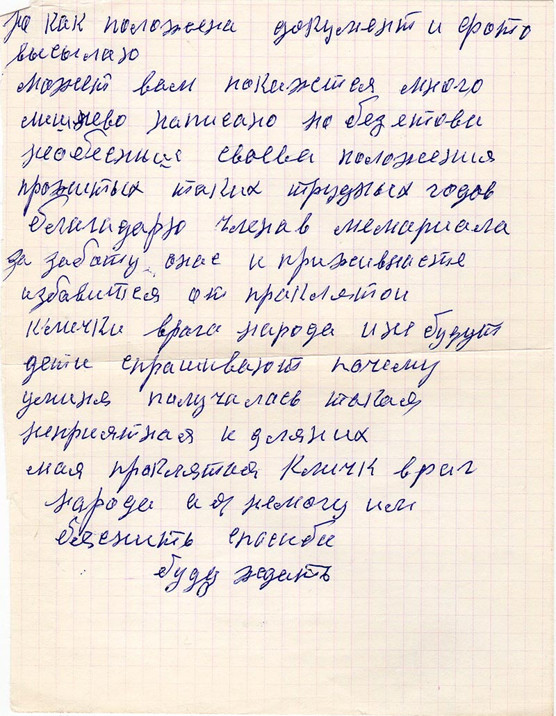 Увожанмая член мемориала Нина и ваши сотрудики с большои благодарнасью квам и незнаю как отблагодарить за вашу заботу о нас исколеченых судьбой людей веть вы вроде из магилы вытаскиваите и я благодарен зато што назакате своеи жизьни узнаю што я тоже человек а не враг народа как был окрешен сталинскам репресиеи и буду умирать чесным совецким гражданинам и едетли сниму пазорное пятна ато ане миня упрекают почему я стал врагом народа а детям таким отцом