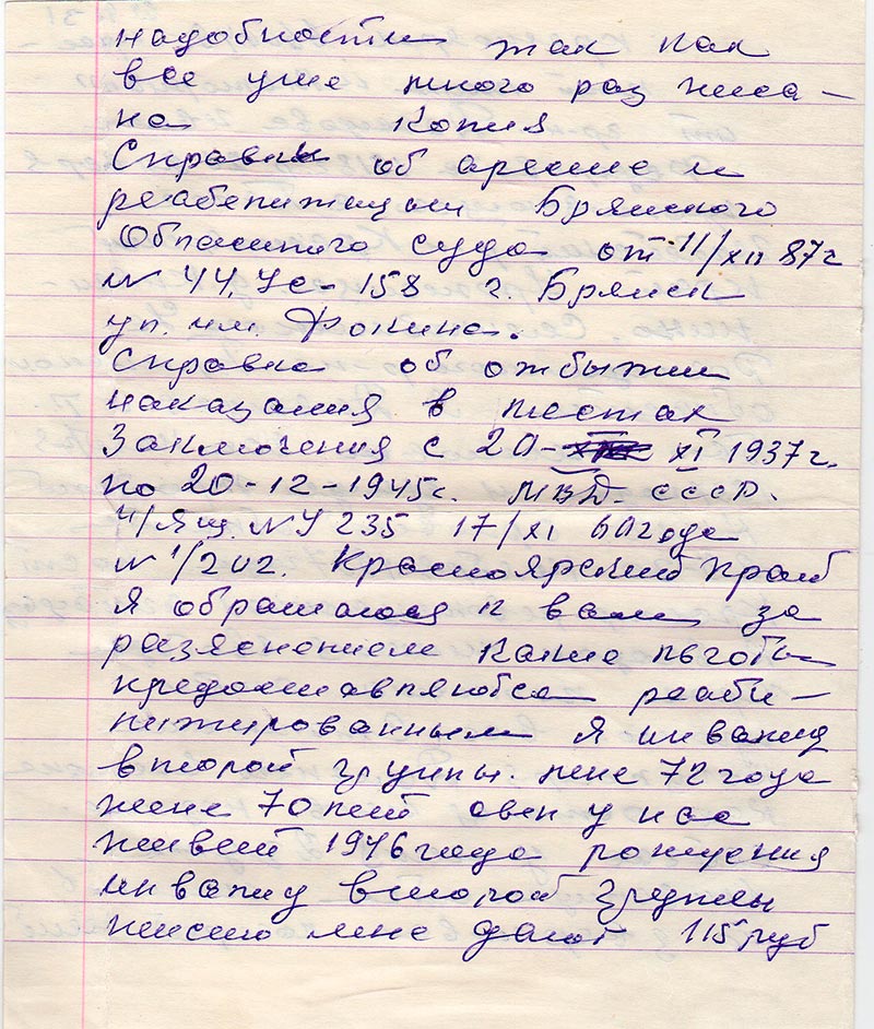 Справки об аресте и реабилитацыи Брянского областного суда от 11/XII 87 г. №