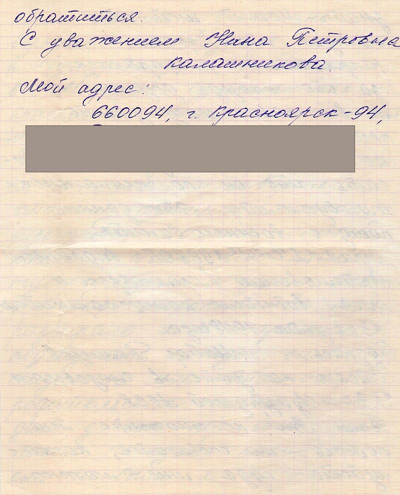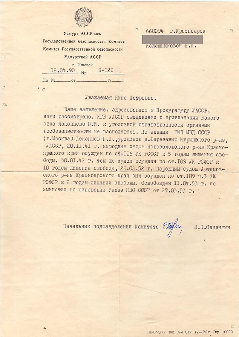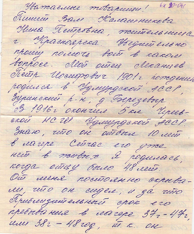 Пишет Вам Калашникова Нина Петровна, жительница г. Красноярска. Убедительно прошу помочь вот в каком вопросе. Мой отец Леканцев Петр Иосифович 1901 г. рождения родился в Удмурдской АССР, Зуринский р-н, д. Березевыр.