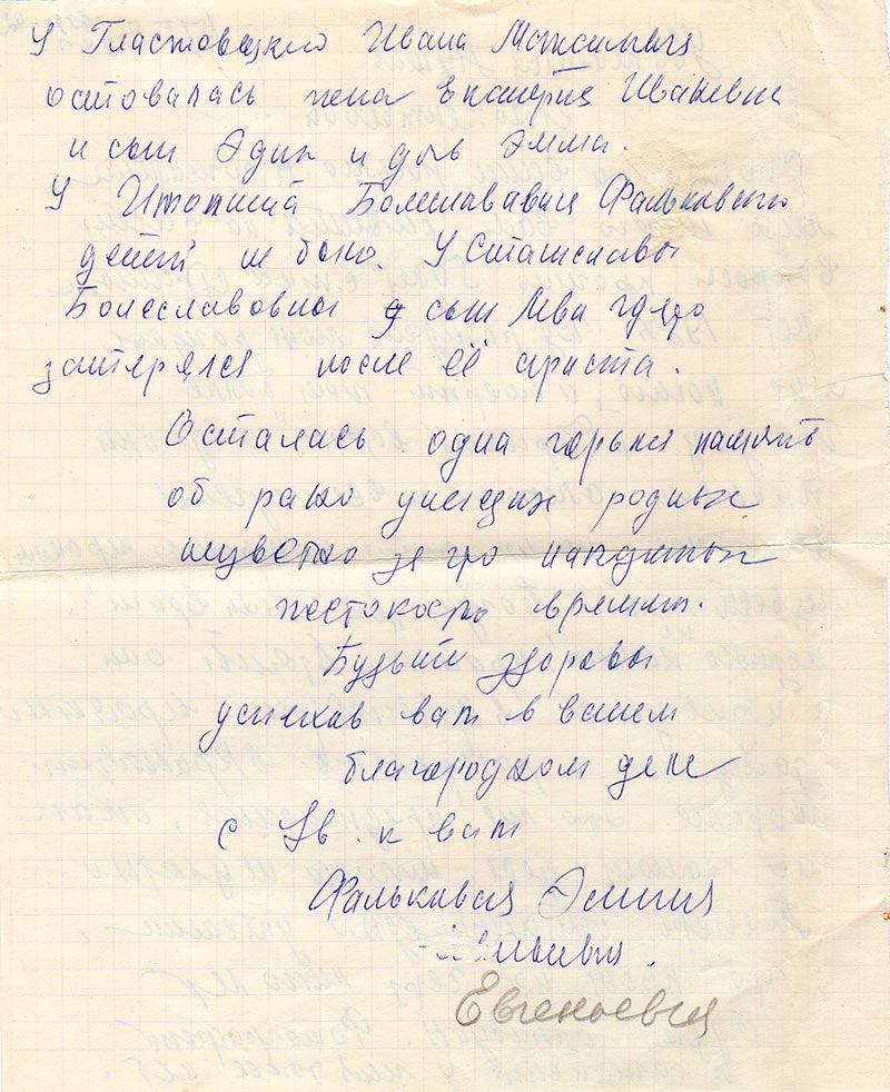 У Гластовцкого Ивана Максимвна остовалась жена Екатерия Иваневна и сын Эдик и дочь Эмма. У Ипполита Болеслававича Фальковского детей не было. У Станиславы Болеславовны сын Лева гдедо затерялся после её проста.