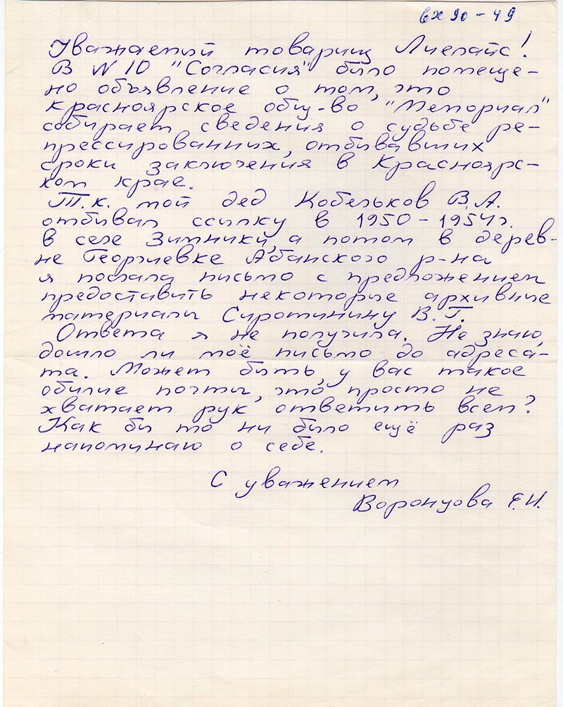 Т.к. мой дед Кобельков В.А. отбывал ссылку в 1950 – 1954 г. в селе Зимники, а потом в деревне Георгиевке Абаканского р-на я послала письмо с предложением некоторые архивные материалы Сиротинину В.Г.