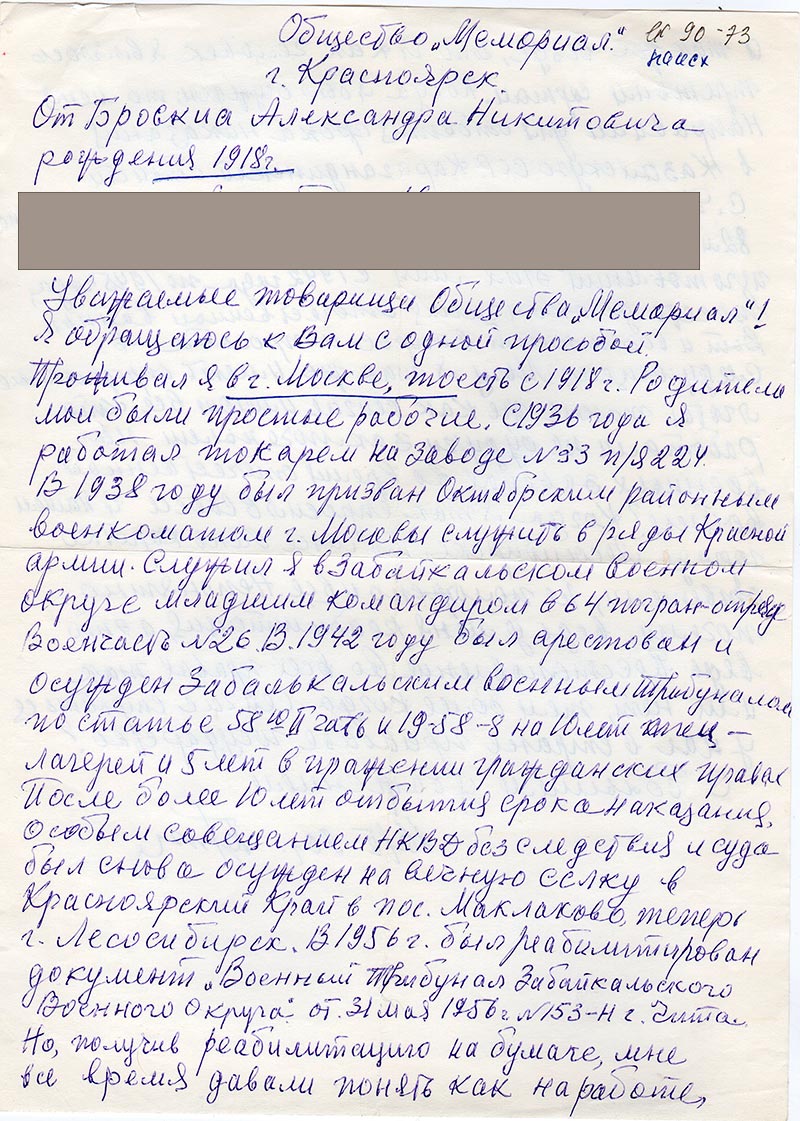 Проживал я в г. Москве, то есть с 1918 г. Родители мои были простые рабочие. С 1936 года я работал токарем на заводе № 33 п/я 224. В 1938 году был призван Октябрьским районным военкоматом г. Москвы служить в ряды Красной армии. Служил я в Забайкальском военном округе младшим командиром в 64 погран. отряде военчасть № 26. В 1942 году был арестован и осужден Забалькальским военным трибуналом по статье 58-ю II часть и 19-58-8 на 10 лет спец. лагерей и 5 лет в пражении гражданских правах. После более 10 лет отбытия срока наказания, особым совещанием НКВД без следствия и суда был снова осужден на вечную ссылку в Красноярский край в пос. Маклаково, теперь г. Лесосибирск.