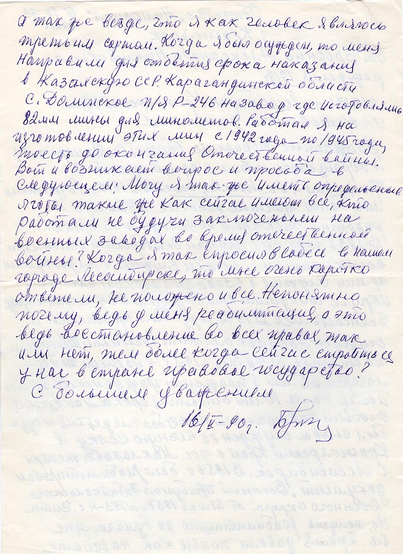 В 1956 г. был реабилитирован документ «Военный трибунал Забайкальского военного округа» от 31 мая 1956 г. №153-Н г. Чита. Но, получив реабилитацию на бумаге, мне все время давали понять как на работе, а так же везде, что я как человек являюсь третьим сортом. Когда я был осужден, то меня направили для отбытия срока наказания в Казахскую ССР. Карагандинской области с. Долинское п/я Р-246 на завод где изготовлялись 82 мм мины для минометов. Работал я на изготовлении этих мин с 1942 года по 1945 года, то есть до окончания Отечественной войны.