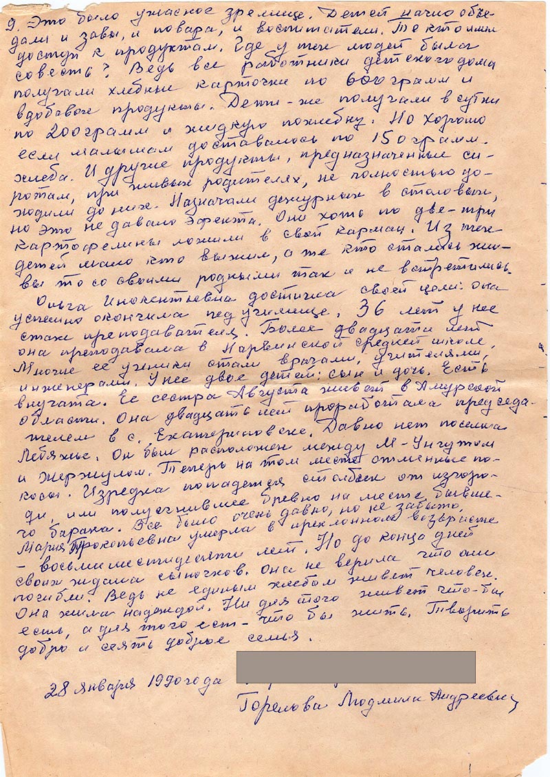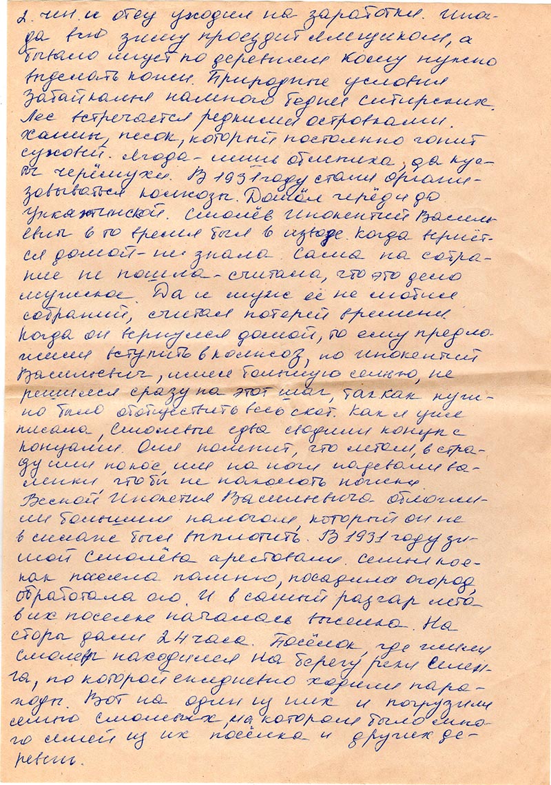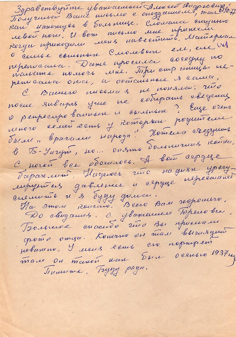 Получила Ваше письмо с опозданием, так как нахожусь в больнице. Сломала ступню левой ноги. И вот письмо мне принесли когда приходили меня навестить. Материал о семье сыльных Смолевых еле, еле переписала. Даже просила соседку по палате помочь мне. Три страницы переписала она, а остальные я сама.