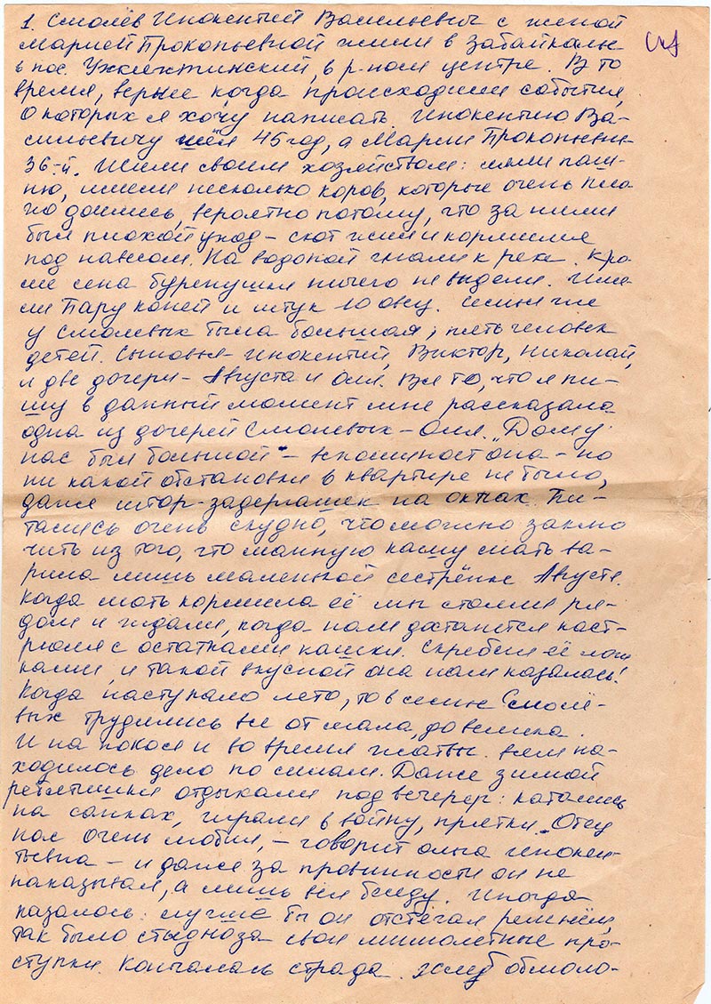 Смолев Инокентий Васильевич с женой Марией Прокопьевной жили в Забайкалье в пос.Ункяхтинский, в р-оном центре. В то время, вернее когда происходили события, о которых я хочу написать, Инокентию Васильевичу шёл 45 год, а Марии Прокопьевне – 36-й. Жили своим хозяйством: имели пашню, имели несколько коров, которые очень плохо доились, вероятно потому, что за ними был плохой уход – скот жил и кормился под навесом. На водопой гнали к реке. Кроме сена буренушки ничего не видели. Имели пару коней и штук 10 овец. Семья же у Смолевых была большая, пять человек детей. Сыновья – Инокентий, Виктор, Николай и две дочери – Августа и Оля. Все то, что я пишу в данный момент мне рассказала одна из дочерей Смолевых – Оля. «Дом у нас был большой. – вспоминает она – но ни какой обстановки в квартире не было, даже штор-задергашек на окнах. Питались очень скудно, что можно закмочить из того, что манную кашу мать варила лишь маленькой сестёнке Августе. Когда мать кормила её мы стояли рядом и ждали, когда нам достанется кастрюля с остатками кашки. Скребли ее ложками, и такой вкусной она нам казалась! Когда наступало лето, то в семье Смолевых трудились все от мала до велика. И на покос и во время жатвы всем находилось дело по силам. Даже зимой ребятишки отдыхали под вечер: катались на санках, играли в войну, прятки. Отец нас очень любил, - говорит Ольга Инокентьевна – и даже за провинности он не наказывал, а лишь вел беседу. Иногда казалось: лучше бы он отстегал ремнём, так было стыдно за свои мимолётные проступки. Кончалась страда. Хлеб обмолочен и отец уходил на заработки. Иногда всю зиму проездит ямщиком, а бывали ???ует по деревням кому нужно выделать кожи.» Природные условия Забайкалья намного беднее Сибирских. Лес встречается редкими островками. Ха???, песок, который постоянно гонит суховей. Ягода – лишь облепиха, да кусты черёмухи. В 1931 году стали организовываться колхозы. Дошёл черёд и до Ункяхтинской. Смолев Инокентий Васильевич в то время был в извозе. Когда вернётся домой – не знала. Сама на собрание не пошла – считала, что это дело мужское. Да и муж не любил собраний, считал потерей времени. Когда он вернулся домой, то ему предложили вступить в колхоз, но Инокентий Васильевич, имея большую семью, не решился сразу на этот шаг, так как нужно было обобществить весь скот. Как я уже писала, Смолевые едва сводили концы с концами. Оля помнит, что летом, в страду или покос, им на ноги надевали валенки, чтобы не поколоть ножки. Весной Инокентия Васильевича обложили большим налогом, который он не в силах был выплатить. В 1931 году зимой Смолева арестовали. Семья кое как посеяла помню, посадила орогод, обработала его. И в самый разгар лета в их поселке началась высылка. На сборы дали 24 часа. Посёлок, где жили Смолевы находился на берегу реки Селенга, по которой ежедневно ходили параходы. Вот на один из них и погрузили семью Смолевых, на котором было много семей из их поселка и других деревень.