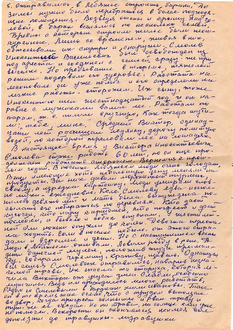 Еще хорошо запомнила Оля как почему то вдруг закричали, заплакали на плоту же???ны дети. Оказалось, что канат соединяющий плоты меж собой – оборвался, и понесло плот вниз по течению Маны, угрожая разбить его об скалы и утесы. Многие в ужасе молились взирая на небо. Но благодаря опытности плоточенов-лоцманов, все обошлось благополучно – без жертв. Плот причалил к берегу, но не в месте назначения – Лебяжьем, а много ниже по течению Маны – в Иртышке, где было много штабелей леса. Словно море волновалась высокая трава. Мужчины сразу же принялись копать землянки. Ведь где то должны были хоть временно найти убежище от зверя, который ходил рядом, проторя тропы в зарослях. В одной землянке помещалось по несколько семей. Там было очень сыро. На пол слали ветки сосны, кедра, пихтача, а на верх стелили траву и потники. Ни окон, ни дверей, ни печей в тех помещениях не было. Кушать варили на кострах, прямо у входа. Но самое страшное было то, что по ночам приходил медведь вплотную к жилью человека. Он садился у входа в землянку и страшно ревел до зари. Лишь эхо откликалось ему вторя по ночам. Люди не могли сомкнуть глаз, боясь за себя, а тем более за детей. На рассвете зверь уходил, но как только скроется солнце за сопкой он возвращался вновь. Днём тоже жили в напряжении, так как чуть пригреет солнце выползали змеи из расщелин скал и грелись на солнцепеке вблизи землянок. Однажды, когда Смолевы детишки вышли погреться, змея укусила Виктора. Хоть он был не маленький, ему шел одинадцатый год, но мальчик очень испугался. Хорошо что среди ссыльных нашлась одна женщина, которая знала лечебные травы. Она делала из них отвары, прикладывала компрессы, и Виктору стало легче. Построив землянки все мужчины отправились в Лебяжье строить бараки. До зимы нужно было перебраться в более подходящее помещение. Возведя стены и крышу над головой, в барак вселились по несколько семей. Бревны с которых строили жилье были неошкуренные. Лишь со временем, живя в них, обтесывали их снутри и снаружи. Смолев Инокентий Васильевич был освобожден из под ареста и соединен с семьей сразу же при выселке. Но пребывание в тюрьме, тяжелый режим подорвали его здоровье. Работа на лесоповале он уже не мог и его определили на легкие работы – сторожем. Их сыну, тоже Инокентию шел шестнадцатый год и он наравне с мужиками валил лес. Работали по парам, т.е. пилили вручную, как тогда шутили: «тебе, мине.» Средний Виктор, одинадцати лет расчищал ледянку, дорогу политую водой, по которой трелевали лес на лошадях. В настоящее время у Виктора Инокентьевича Смолева стаж работ 60 лет, но он еще продолжает работать сторожем. Вернемся к прошлым годам. В поселке Лебяжьем люди очень голодали. Вещи имеющие хоть небольшую цену меняли на продукты. За них давали мороженный турнепа, свеклу, а изредка картошку. Люди умирали словно мухи – ежедневно. Коле Смолеву едва исполнилось девять лет и мать была вынуждена посылать его побираться по деревням. Кто даст кусочек, кто пару картошек, кто погреет и даст похлебки, а бывали и собак спускали. У шестилетней Оли ножки опухли до колен. Девочка перестала ходить. Соли в поселке не было. От этого страдали и взрослые и дети. Но с наступлением весны люди в Лебяжьем оживали. Ловили рыбу в реке. А дети баночкой мулех, положив туда приманку. Собирали черемшу, крапиву, щавель. Однажды вся семья См