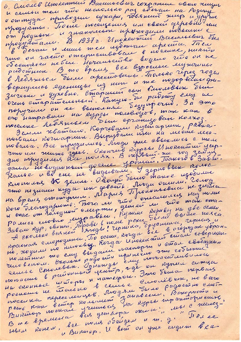 Смолев Инокентий Васильевич сохранил свою жизнь и семьи тем что несколько раз сбегал на Родину и оттуда привозил сухари, говяжий жир и другие продукты. После посещения им своей деревни им от родных и знакомых приходили посылки с продуктами. В 1937 году был в бегах и лишь тем избежал ареста. Тем что он часто отсутствовал в поселке, никто обеспокоен не был. Начальство видело что он не работник. В то время все взрослые мужчины в Лебяжьем были арестованы. Только через годы вернулись единицы из них и те подорваны физически и духовно. Старший сын Смолевых был очень старательный. Какую бы работу ему не поручили он ее выполнял безупречно. За это его направили на курсы полеводов, так как в поселке Лебяжьем был организован колхоз.