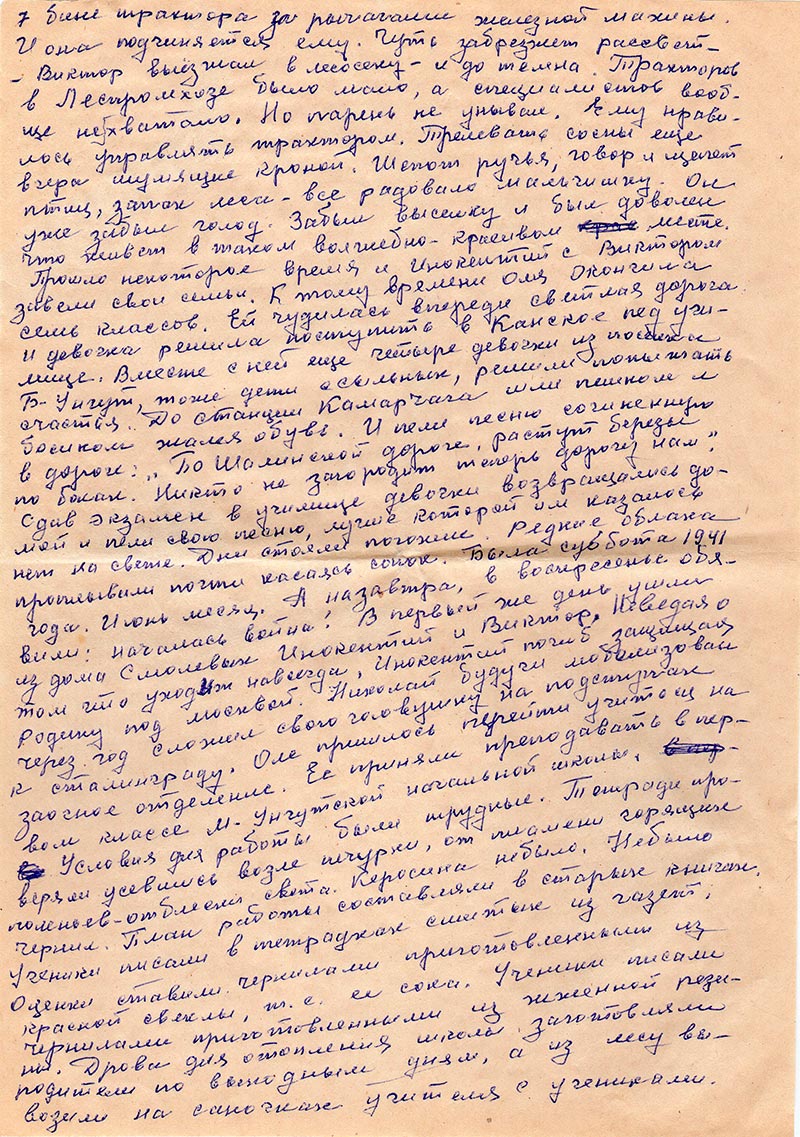 Земли хватало. Корчевали кустарник, раскапывали кочкарник. Вырубали пни на месте лесоповала. Все трудились. Люди уже свыклись с тем что им жить здесь. Окончив курсы Инокентий усердно трудился на полях. В первый же год земля дала невиданный доселе урожай. Такого в Забайкалье и во сне не видели. У зерновых колос клонился к земле. Овощей было такое изобилие что не знали куда их девать. Люди ожили. Голод на время отступил. Мария Прокопьевна не знала кого благодарить. Бога ли что сжалился над ними и спас от голодной смерти, детей ли что так старались словно муравьи. Купили корову на две семьи. Завели кур, свиней. Травы в поле реки были выше пояса. А сколько всякой ягоды: черника, брусника, черная и красная смородина. По осени, когда все в огородах убрано ходили по клюкву. Когда Инокентий стал совершеннолетним то ему выдали паспорт и стал свободным человеком. Сколько радости принесло это событие семье Смолевых. Однажды ему посчастливилось попасть в районный центр, где он купил ситца на оконные шторы и патефон. Это была первая роскошь не только в семье Смолевых, но всего поселка переселенцев. Людям было радостно смотреть как ветер колышит занавески. Вскорости и Виктор поехал учиться на курсы трактористов, в те времена вся детвора пела: «мы с железным конем все поля обойдем и т.д.» Пел и Виктор. И вот он уже сидит в кабине трактора за рычагами железной махины. И она подчиняется ему. Чуть забрезжет рассвет – Виктор выезжал в лесосеку – и до темна. Тракторов в Леспромхозе было мало, а специалистов вообще не хватало. Но парень не унывал. Ему нравилось управлять трактором. Трелевать сосны еще вчера шумящие кроной. Шепот ручья, говор и щепет птиц, запах леса – все радовало мальчишку. Он уже забыл голод. Забыл выселку и был доволен что живет в таком волшебно-красивом месте. Прошло некоторое время и Инокентий с Виктором завели свои семьи. К тому времени Оля окончила семь классов. Ей чудилась впереди светлая дорога и девочка решила поступить в Канское педучилище. Вместе с ней еще четыре девочки из поселка Б-Унгут, тоже дети ссыльных, решили попытать счастье. До станции Камарчага шли пешком и босиком жалея обувь. И пели песню сочиненную в дороге: «По Шалинской дороге, растут берёзы по бокам. Никто не загородит теперь дорогу нам.» Сдав экзамен в училище девочки возвращались домой и пели свою песню, лучше которой им казалось нет на свете. Дни стояли погожие. Редкие облака проплывали почти касаясь сопок. Была суббота 1941 года. Июнь месяц. А назавтра, в воскресенье обявили: началась война! В первый же день ушли из дома Смолевых Инокентий и Виктор, неведая о том что уходит навсегда, Инокентий погиб защищая Родину под Москвой. Николай будучи мобилизован через год сложил свою головушку на подступах к Сталинграду. Оле пришлось перейти учиться на заочное отделение. Ее приняли преподавать в первом классе М.Унгутской начальной школы. Условия для работы были трудные. Тетради проверяли усевшись возле печурки, от пламени горящих поленьев – отблики света. Керосина не было. Не было чернил. План работы составляли в старых книжках. Ученики писали в тетрадках смятых из газет. Оценки ставили чернилами приготовленными из красной свеклы, т.е. ее сока. Ученики писали чернилами приготовленными из жженой резины. Дрова для отопления школы заготавливали родители по выходным дням, а из л