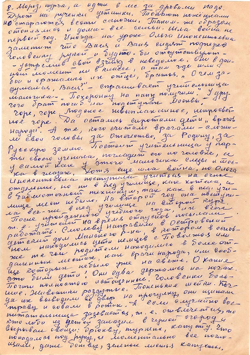 С Вашего письма я не поняла: что после января уже не собирать сведения о репресированных и сыльных? Еще очень много семей есть у которых родители были «врагами народа». Хотела съездить в Б-Унчут, но… опять больничная койка. С ногой все обошлось. А вот сердце барахлит. Надеюсь что на днях урегулируется давление и сердце перестанет спешить и я буду дома.