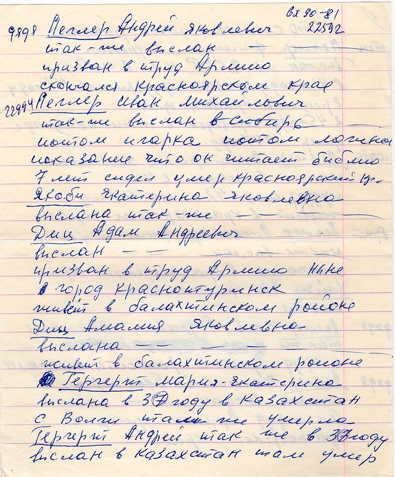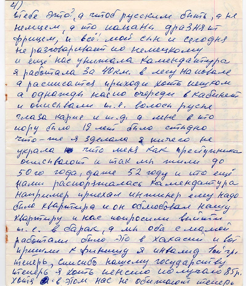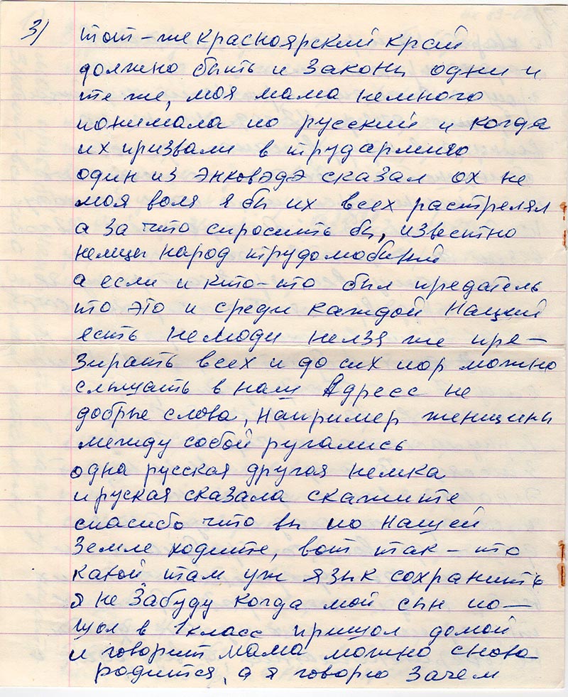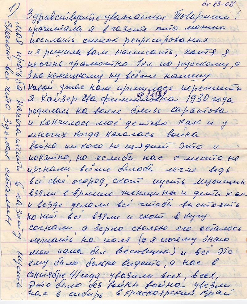 Прочитала я в газете что можно послать список репрессированных и я решила вам написать, хотя я не очень грамотно 1 кл. по русскому, а 3 по немецкому ну всё же напишу. Какой ужас нам пришлось пережить. Я Кайзер Ева Филлимоновна 1930 года родилась на волге близь Саратова и кончилось моё детство как и у многих когда началась война война ни кого не щядит это и понятно, но если бы нас с место не изгнали всёже былобы легче ведь всё своё огород, скот пусть мужщик взяли в Армию женщины и дети как и веде делали всё чтобы выстоять но нет всё взяли и скот в кучу согнали, а зерно сколько его осталось лежать на поле (а я почему знаю мой папа был весовщик) и всё это ему было больно видеть, а нас в сентябре 41 года увазили всех, всех это было без войны война увезли нас в сибирь в красноярский край.