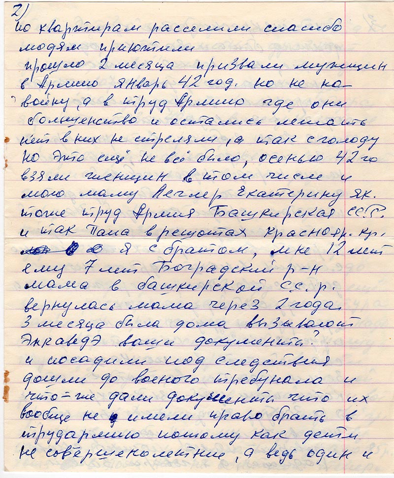 по квартирам расселили спасибо людям приютили прошло 2 месяца призвали мужщин в Армию январь 42 год. Но не на войну, а в труд Армию где они большенство и остались лежать нет в них не стреляли, а итак сголоду но это ещё не всё было, осенью 42 го взяли женщин в том числе и мою маму Леглер Екатерина Як. тоже труд Армия Башкирская ССР и так папа в Решотах Краснояр. кр. я с братом, мне 12 лет ему 7 лет Боградский р-н мама в Башкирской ССР. Вернулась мама через 2 года 3 месяца была дома вызывают Энкаведэ ваши документы? И посадили под следствия дошли до военого требунала и что-же дали документы что их вообще не имели право брать в трудармию потому как дети не совершенолетние, а ведь один и тот-же Красноярский край должно быть и законы одни и те же, моя мама немного понимала по русский и когда их призвали в трудармию один из энковэдэ сказал ох не моя воля я бы их всех растрелял а за что спросить бы, известно немцы народ трудолюбивый а если и кто-то был предатель то это и среди каждой нации есть нелюди нельзя же презирать всех и до сих пор можно слышать в наш Адресс не добрые слова, например женщины между собой ругались одна русская другая немка и руская сказала скажите спасибо что вы по нашей Земле ходите, вот так-то какой там уж язык сохранить я не забуду когда мой сын пошол в 1 класс пришол домой и говорит мама можно снова родиться, а я говорю зачем тебе это?, а чтоб русским быть, а не немцем, а то пацаны дразнят фрицем, и всё! Мой сын и сегодня не разговаривает по немецкому и ещё нас унижала камендатура я работала за 40 км. в лесу на повале а расписаться приходи хоть пешком а однажды нас по очереди в кабинет и описывали т.е. волосы русие глаза карие и т.д. а мне в то пору было 19 лет было стыдно что-же я зделала я ничего не украла что меня как преступника описывают и так мы жили до 50 го года, даже 52 году и то ещё нами распоряжалась камендатура например приехал инжинер ему надо было квартира и он облюбовал нашу квартиру и нас попросили выйти т.е. в барак, а мы оба с мамой работали было это в Хакасии и вот пришли к финишу я инвалид 1-ой гр. Теперь, спасибо нашему государству теперь я хоть пенсию получаю 85 р. Хотя в этом нас не обижают теперь А это список моих родных