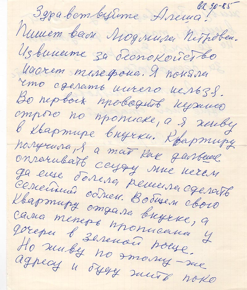 Извините за беспокойство насчет телефона. Я поняла что сделать ничего нельзя. Во первых проводить нужно строго по прописке, а я живу в квартире внучки. Квартиру получила, я а так как дальше оплачивать ссуду мне нечем да еще болела решила сделать семейный обмен. Вобщем свою квартиру отдала внучке, а сама теперь прописана у дочери в зеленой роще. Но живу по этому-же адресу и буду жить поко живу. За квартиру плотит внучка, так- как документы на ее имя.