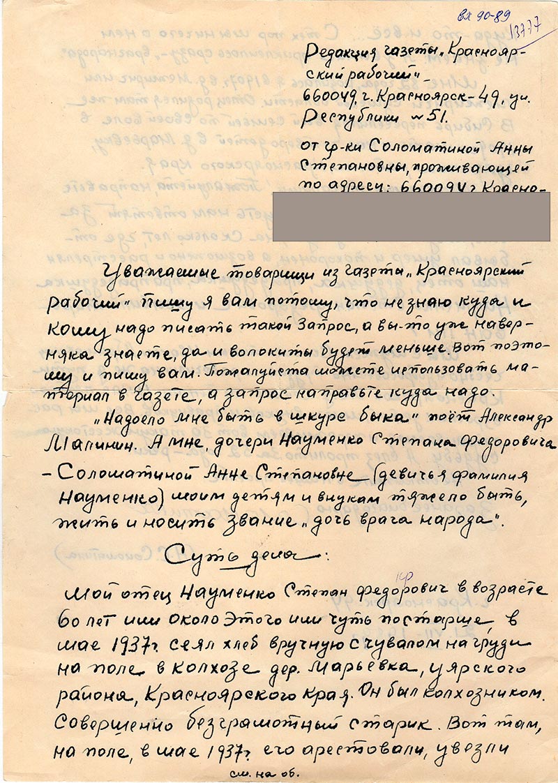 Уважаемые товарищи из газеты «Красноярский рабочий» пишу я вас потому, что не знаю куда и кому надо писать такой запрос, а вы то уж наверняка знаете, да и волокиты будет меньше. Вот поэтому и пишу вам. Пожалуйста можете использовать материал в газете, а запрос направьте куда надо.