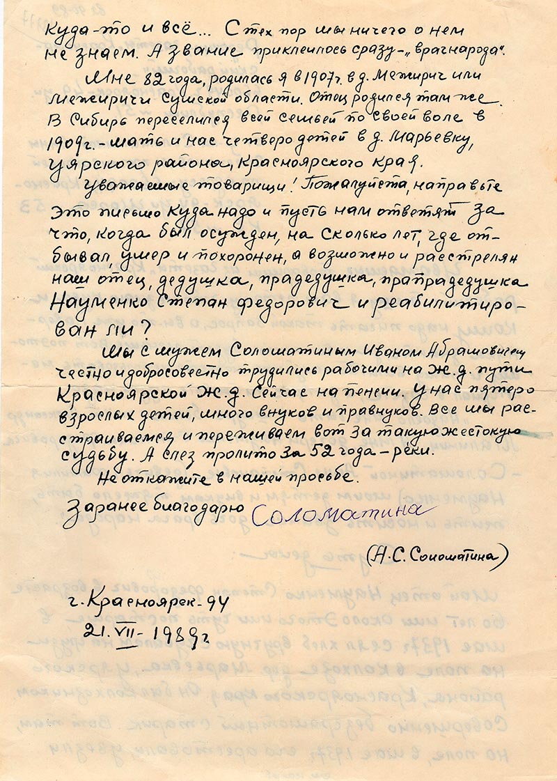 Уважаемые товарищи! Пожалуйста, направьте это письмо куда надо и пусть нам ответят за что, когда был осужден, на сколько лет, где отбывал, умер и похоронен, а возможно и расстрелян наш отец, дедушка, прадедуш-ка, прапрадедушка Науменко Степан Федорович и реабилитирован ли?