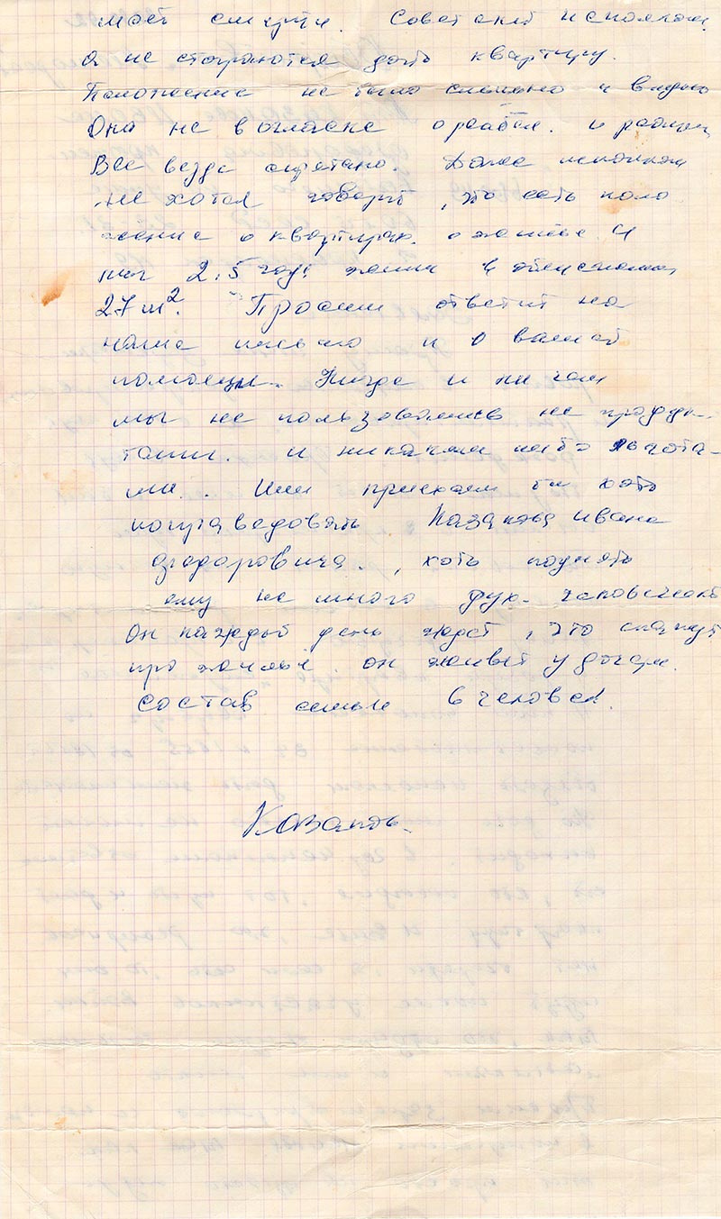 Просим ответит на наше письмо и о вашей помощи. Нигде и ни чем мы не пользовались не продуктами и никакими либо льготами. Или приехали бы хоть пораведовать Казакова Ивана Федоровича, хоть поднять ему не много дух. человеческий. Он каждый день ждет, что скажут про жилье. Он живет у дочери.