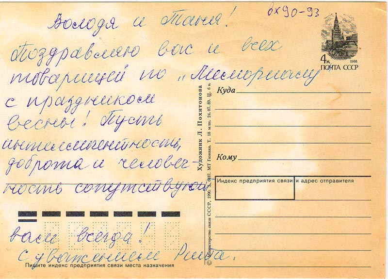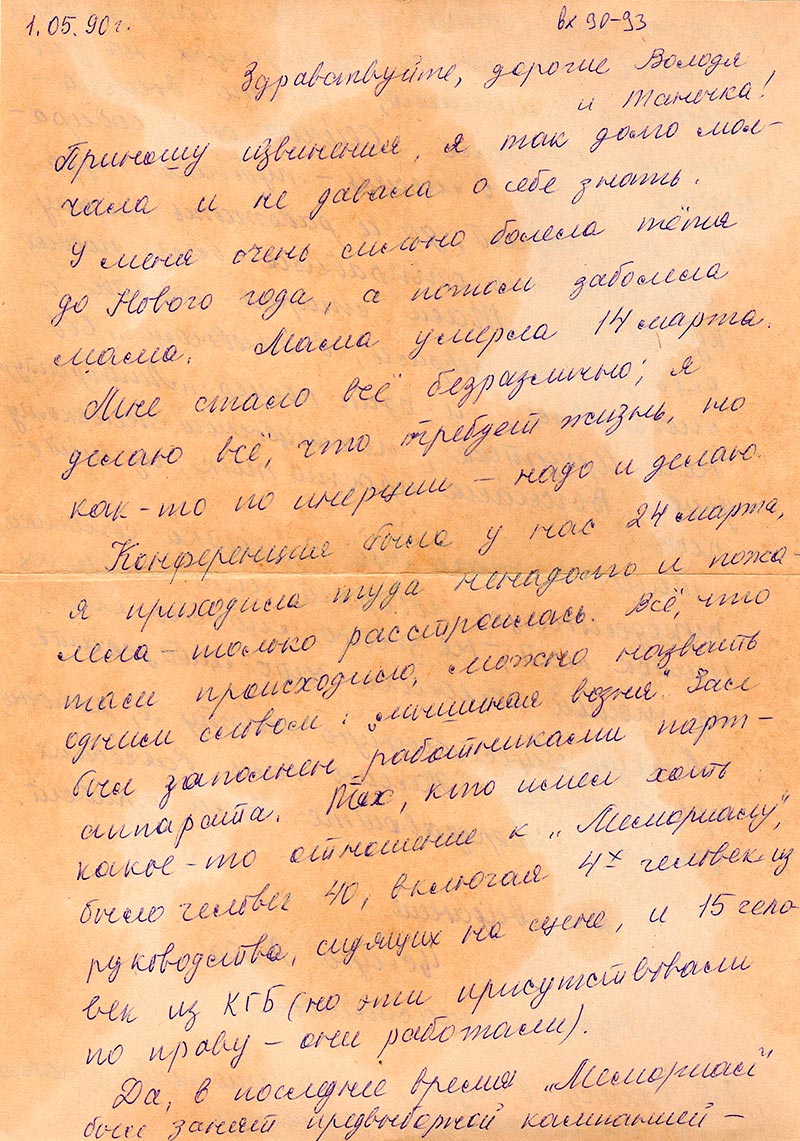Конференция была у нас 24 марта, я приходила туда ненадолго и пожалела – только расстроилась. Всё, что там происходило, можно назвать одним словом: «мышиная возня». Зал был заполнен работниками партаппарата. Тех, кто имел хоть какое-то отношение к «Мемориалу», было человек 40, включая 4х человек из руководства, сидящих на сцене, и 15 человек из КГБ (но они присутствовали по праву – они работали).